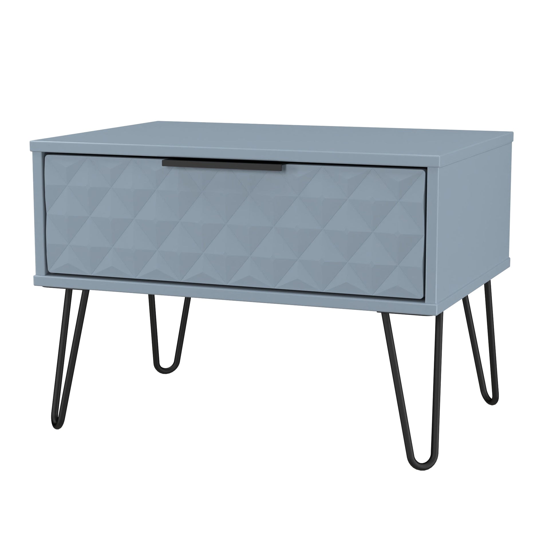 This single drawer bedside cabinet is wider than normal for added practicality. Perfect for any bedside or as a free standing storage unit. A modern and distinctive range. This ranges unique aesthetic is best represented by the distinctive "Harlequin" patten of the drawer and door fronts. Also features Black Metal Handles and Black Hairpin Legs. Comes in a wide range of colours including eye cathching two tone colour combinations. All our furniture is made to order in the United Kingdom, to the highest quality using responsibly sourced materials. It is delivered within 10 working days direct to your location of choice by one of our two man delivery teams, and comes fully assembled (although items with legs will have those legs removed during transit to avoid damage). Part of the Harlequin Collection.