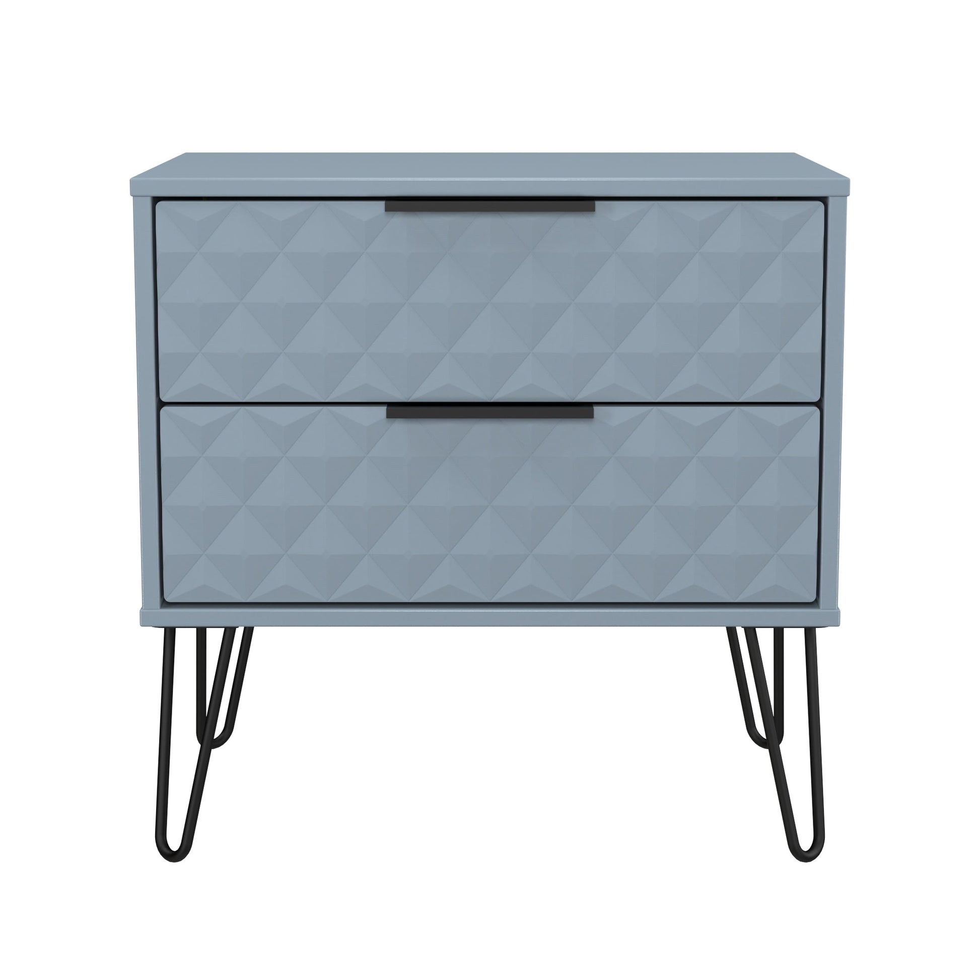 This 2 drawer bedside cabinet is wider than normal for added practicality. Perfect for any bedside or as a free standing storage unit. A modern and distinctive range. This ranges unique aesthetic is best represented by the distinctive "Harlequin" patten of the drawer and door fronts. Also features Black Metal Handles and Black Hairpin Legs. Comes in a wide range of colours including eye cathching two tone colour combinations. All our furniture is made to order in the United Kingdom, to the highest quality using responsibly sourced materials. It is delivered within 10 working days direct to your location of choice by one of our two man delivery teams, and comes fully assembled (although items with legs will have those legs removed during transit to avoid damage). Part of the Harlequin Collection.