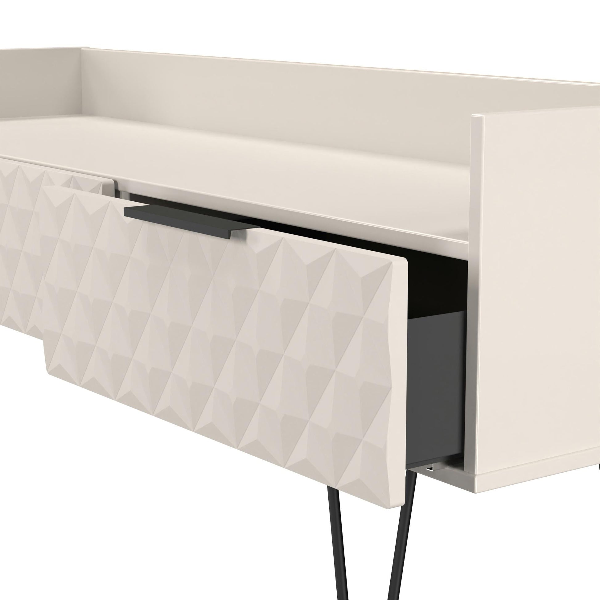 This media Console unit features 2 storage drawers on smooth metal runners. A modern and distinctive range. This ranges unique aesthetic is best represented by the distinctive "Harlequin" patten of the drawer and door fronts. Also features Black Metal Handles and Black Hairpin Legs. Comes in a wide range of colours including eye cathching two tone colour combinations. All our furniture is made to order in the United Kingdom, to the highest quality using responsibly sourced materials. It is delivered within 10 working days direct to your location of choice by one of our two man delivery teams, and comes fully assembled (although items with legs will have those legs removed during transit to avoid damage). Part of the Harlequin Collection.