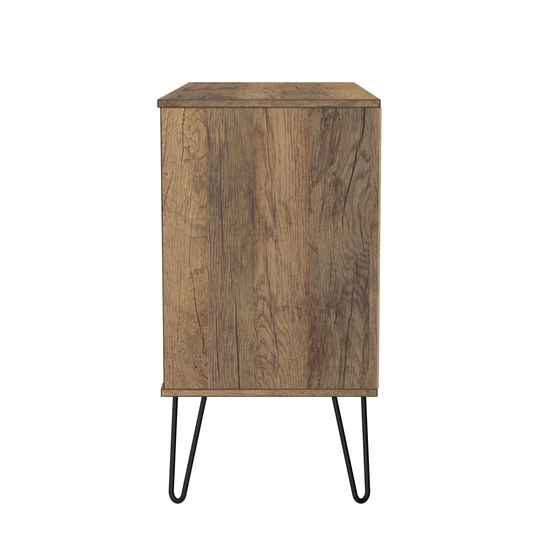 This modern storage unit features 3 drawers and a large storage area with a single shelf. Can be used as a TV/Media unit or sideboard. A modern and distinctive range. This ranges unique aesthetic is best represented by the distinctive "Harlequin" patten of the drawer and door fronts. Also features Black Metal Handles and Black Hairpin Legs. Comes in a wide range of colours including eye cathching two tone colour combinations. All our furniture is made to order in the United Kingdom, to the highest quality using responsibly sourced materials. It is delivered within 10 working days direct to your location of choice by one of our two man delivery teams, and comes fully assembled (although items with legs will have those legs removed during transit to avoid damage). Part of the Harlequin Collection.