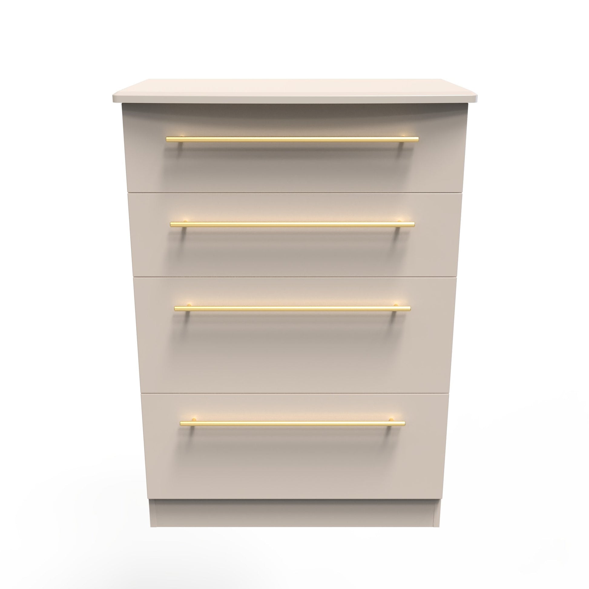 This deep 4 drawer chest of drawers is practical and stylish. Perfect for any home as a free standing storage unit. This range is modern and elegant with a smooth clean design. Features sleek gold T-Bar handles and comes ina range of scratch resistant colours. All our furniture is made to order in the United Kingdom, to the highest quality. It is delivered within 10 working days direct to your location of choice by one of our two man delivery teams, and comes fully assembled (although legs may be removed to prevent damage in transit). Part of the Haworth Collection.
