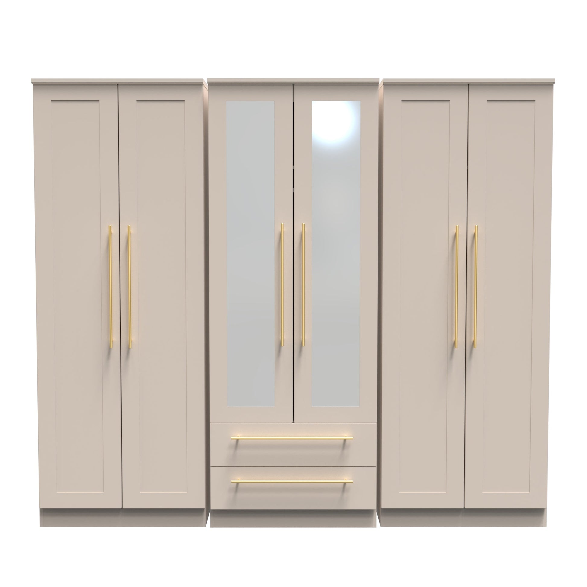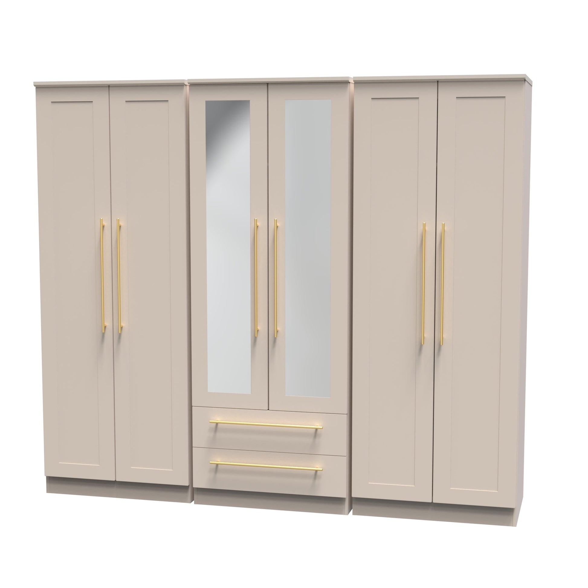 Haworth Tall Mirror Wardrobe Off-White 6 Doors 2 Shelves 2 Drawers 222cm