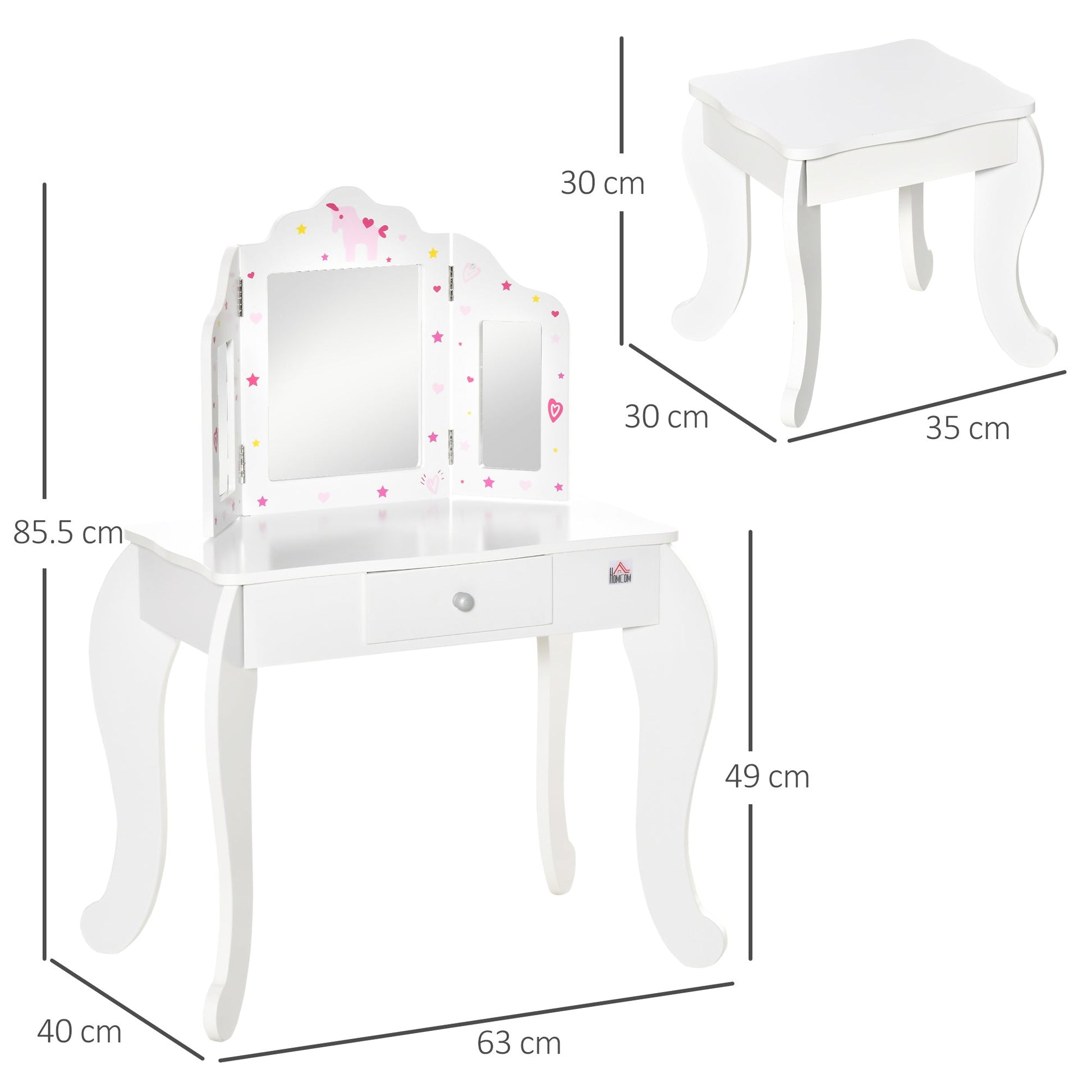 Homcom Kids Vanity Table & Stool Girls Dressing Set Make Up Desk Chair Dresser Play Set With Rotatable Mirrors Drawer Star & Heart Pattern White