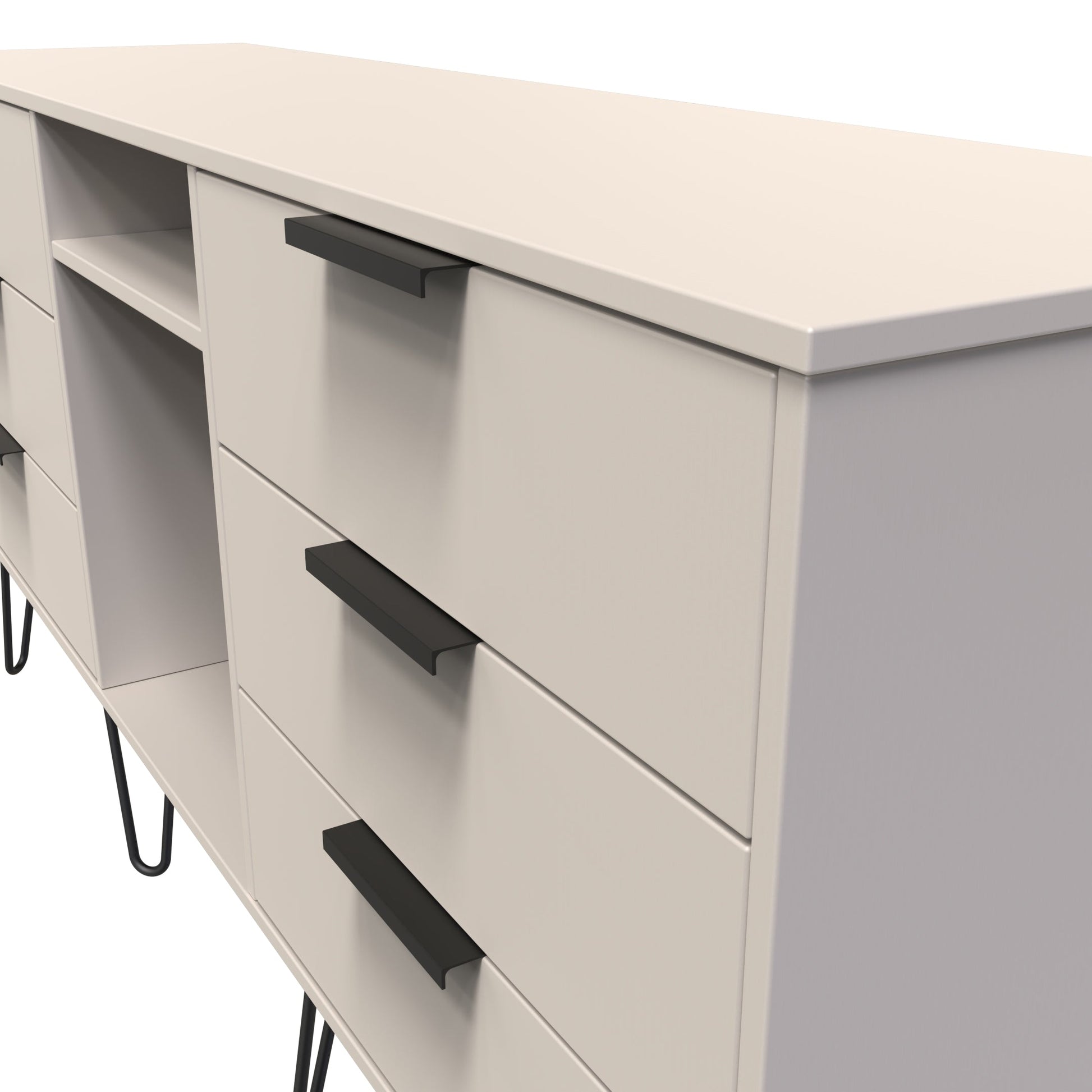This wide storage unit features 6 storage drawers with a central shelf. Suitable for use as a TV/Media unit or sideboard. Choosing between subtle neutral and elegant earthy tones, you'll be amazed at how well this collection can enhance a space. You can be certain it will be engaging, with a sophisticated and durable finish. The extensive colour options are complimented with a variety of different leg options. All our furniture is made to order in the United Kingdom, to the highest quality. It is delivered within 10 working days direct to your location of choice by one of our two man delivery teams, and comes fully assembled (although legs may be removed to prevent damage in transit). Part of the Hong Kong C Collection.