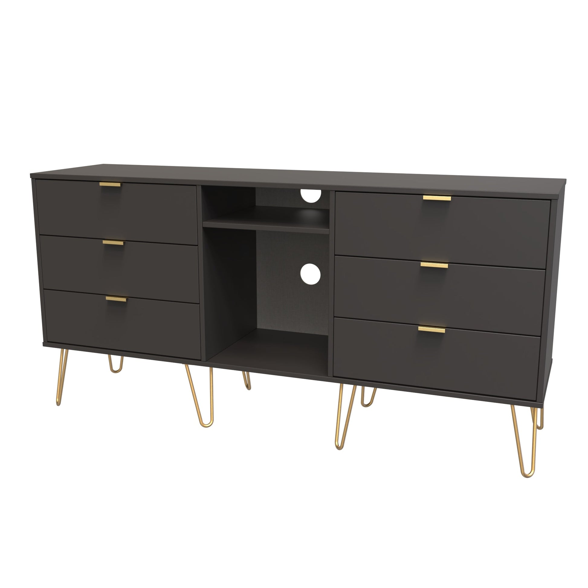This wide storage unit features 6 storage drawers with a central shelf. Suitable for use as a TV/Media unit or sideboard. Modern and stylish, this striking range is available in a range of durable scratch resistant colour or natural wood finishes. With pull handles on all doors and drawers, with gold hairpin metal legs. Comes with Soft Close Drawers. All our furniture is made to order in the United Kingdom, to the highest quality. It is delivered within 10 working days direct to your location of choice by one of our two man delivery teams, and comes fully assembled (although legs may be removed to prevent damage in transit). Part of the Hong Kong F Collection.