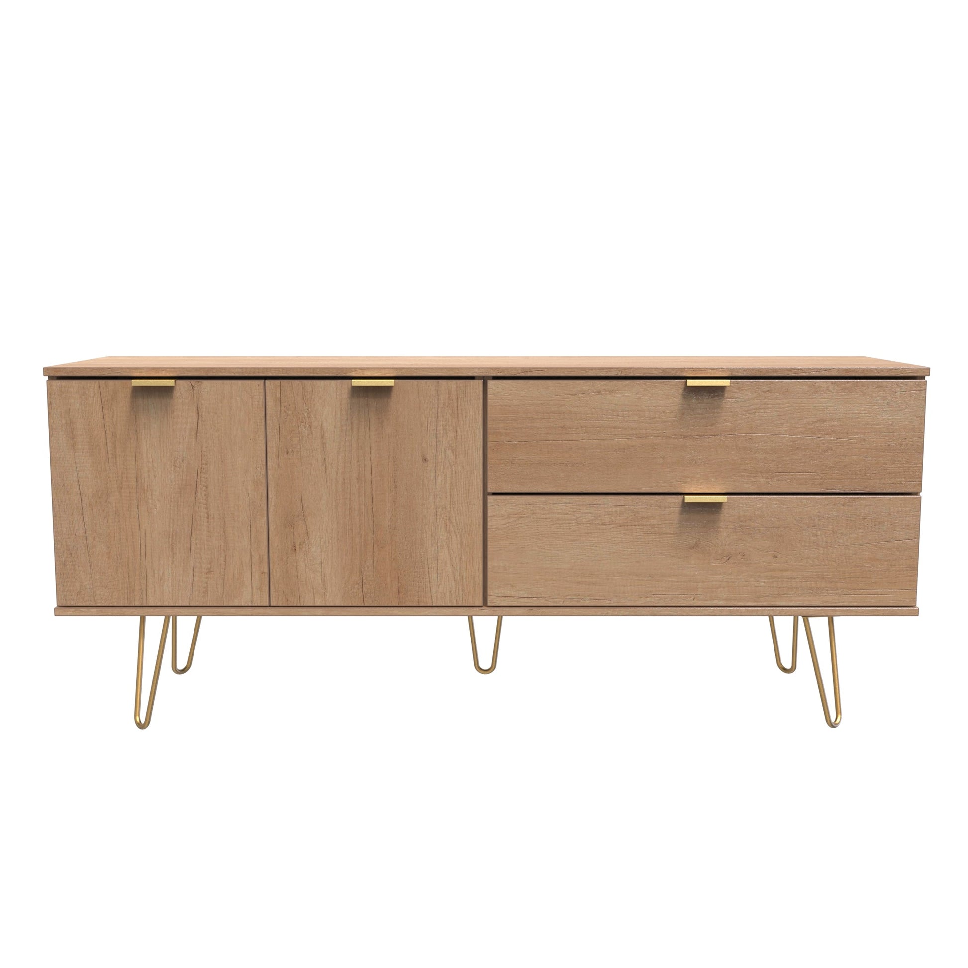 This modern wide sideboard features 2 storage drawers and a double door canbinet. Modern and stylish, this striking range is available in a range of durable scratch resistant colour or natural wood finishes. With pull handles on all doors and drawers, with gold hairpin metal legs. Comes with Soft Close Drawers. All our furniture is made to order in the United Kingdom, to the highest quality. It is delivered within 10 working days direct to your location of choice by one of our two man delivery teams, and comes fully assembled (although legs may be removed to prevent damage in transit). Part of the Hong Kong F Collection.