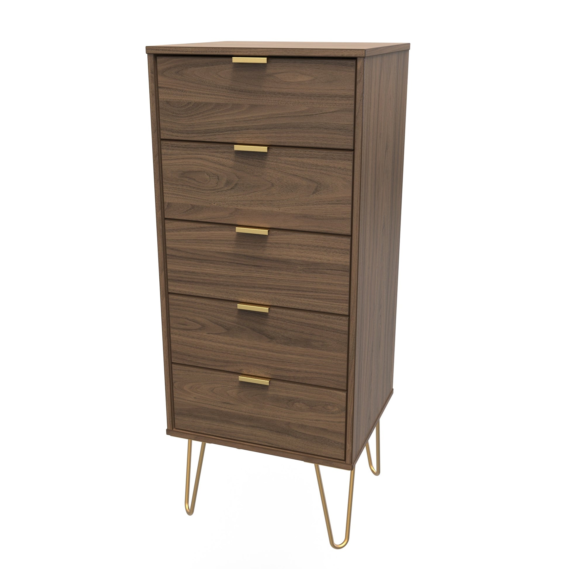 This 5 drawer chest of drawers is practical and stylish. Perfect for any home as a free standing storage unit. Modern and stylish, this striking range is available in a range of durable scratch resistant colour or natural wood finishes. With pull handles on all doors and drawers, with gold hairpin metal legs. Comes with Soft Close Drawers. All our furniture is made to order in the United Kingdom, to the highest quality. It is delivered within 10 working days direct to your location of choice by one of our two man delivery teams, and comes fully assembled (although legs may be removed to prevent damage in transit). Part of the Hong Kong F Collection.