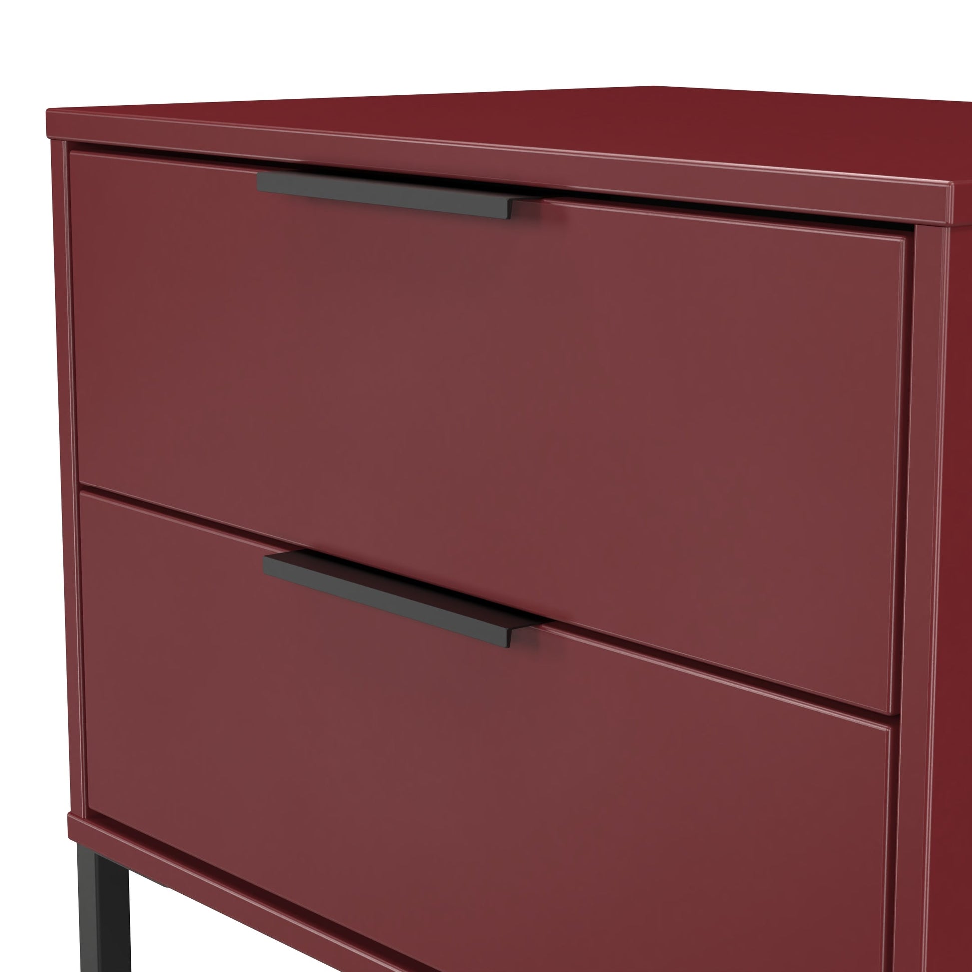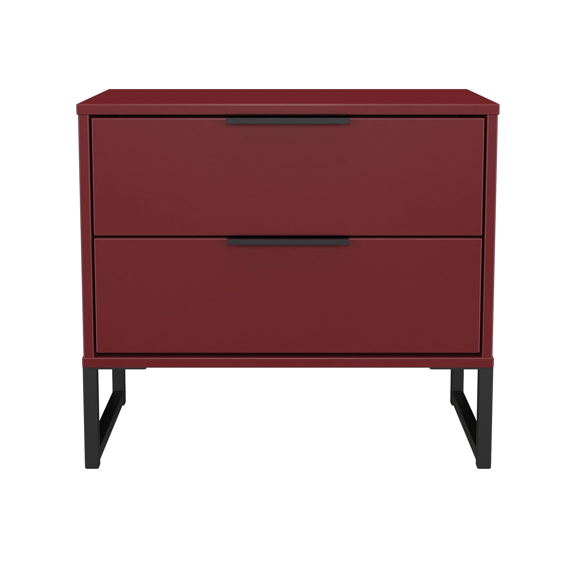 This 2 drawer bedside cabinet is wider than normal for added practicality. Perfect for any bedside or as a free standing storage unit. Modern and stylish, this striking range is available in a range of durable scratch resistant colour or natural wood finishes. With pull handles on all doors and drawers, with black sleigh metal legs. Comes with Soft Close Drawers. All our furniture is made to order in the United Kingdom, to the highest quality. It is delivered within 10 working days direct to your location of choice by one of our two man delivery teams, and comes fully assembled (although legs may be removed to prevent damage in transit). Part of the Hong Kong G Collection.