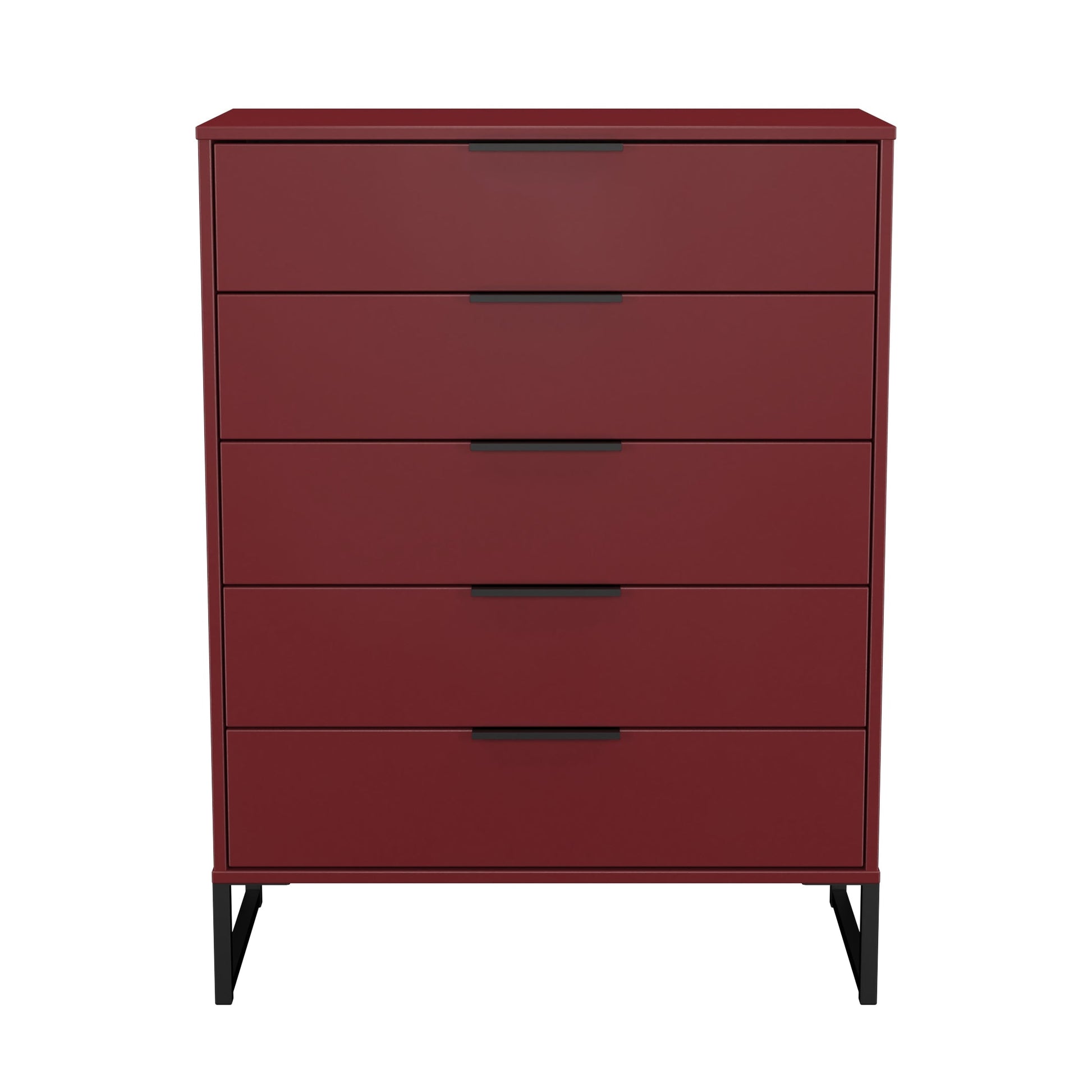 This wide 5 drawer chest of drawers is practical and stylish. Perfect for any home as a free standing storage unit. Modern and stylish, this striking range is available in a range of durable scratch resistant colour or natural wood finishes. With pull handles on all doors and drawers, with black sleigh metal legs. Comes with Soft Close Drawers. All our furniture is made to order in the United Kingdom, to the highest quality. It is delivered within 10 working days direct to your location of choice by one of our two man delivery teams, and comes fully assembled (although legs may be removed to prevent damage in transit). Part of the Hong Kong G Collection.