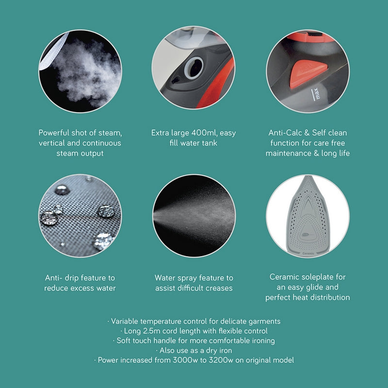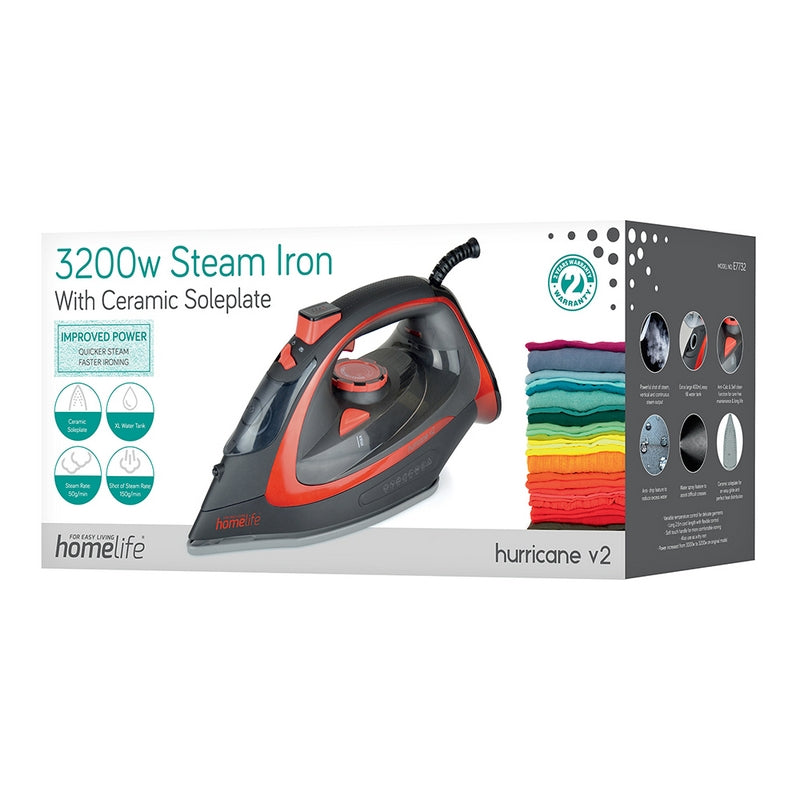 This Hurricane v2 Steam Iron boasts a range of features to quickly banish creases from clothing, towels and linens. With a ceramic soleplate for an easy glide and even heat distribution, and options for steam, vertical steam, shot of steam, dry and spray. 3200W high power for fast heat and more steam. Anti-drip, with an extra large easy-fill water tank. The self-clean and anti-calc functions contribute to lower maintenance and longer life. Soft touch handle and a stylish black and red colour scheme.