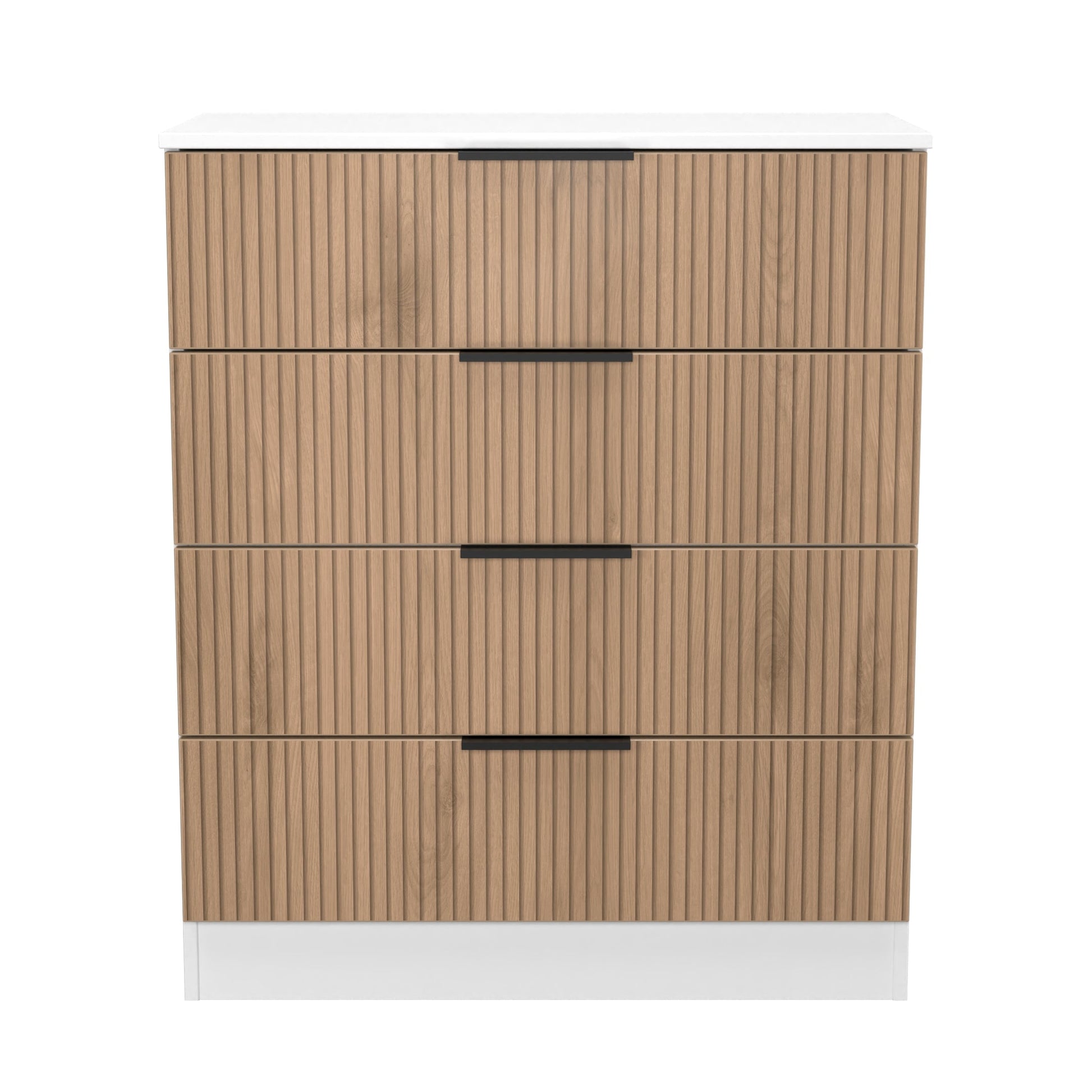 This wide 4 drawer chest of drawers is practical and stylish. Perfect for any home as a free standing storage unit.A strinking new range with a eye catching Slat Effect patten on the fronts or the doors and drawers, as well as sleek black metal handles. Modern and striking this range will stand out in any modern home.All our furniture is made to order in the United Kingdom, to the highest quality using responsibly sourced materials. It is delivered within 10 working days direct to your location of choice by one of our two man delivery teams, and comes fully assembled (although items with legs will have those legs removed during transit to avoid damage). Part of the Java Collection.