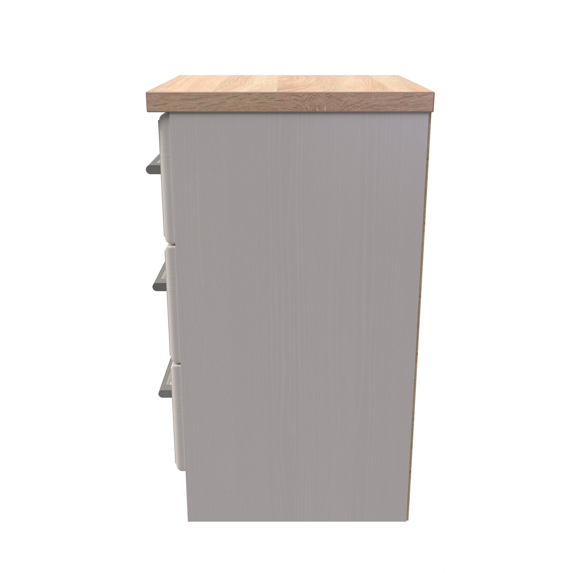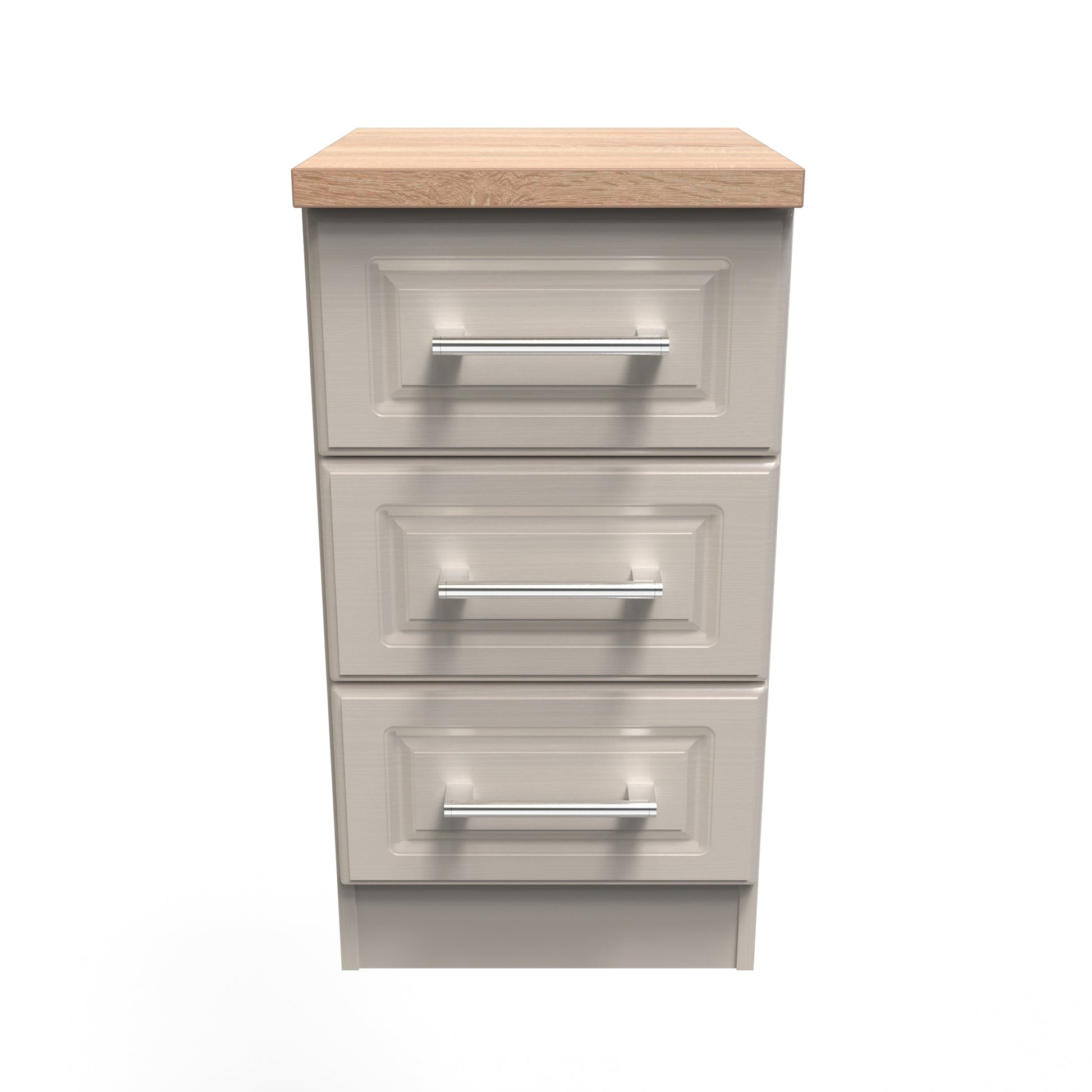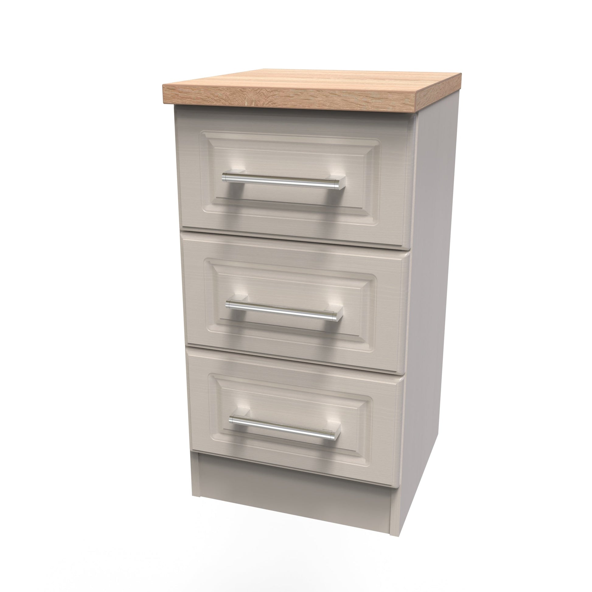 This 3 drawer bedside cabinet is practical and stylish. Perfect for any bedside or as a free standing storage unit. This iconic range uses traditional edge finishes and wood effect tops, to create a range of classic looking furniture pieces. Contrasting finishes create the tonal variations seen here with brushed steel handle mounted on wood grained fronts. All our furniture is made to order in the United Kingdom, to the highest quality. It is delivered within 10 working days direct to your location of choice by one of our two man delivery teams, and comes fully assembled (although legs may be removed to prevent damage in transit). Part of the Kent Collection.