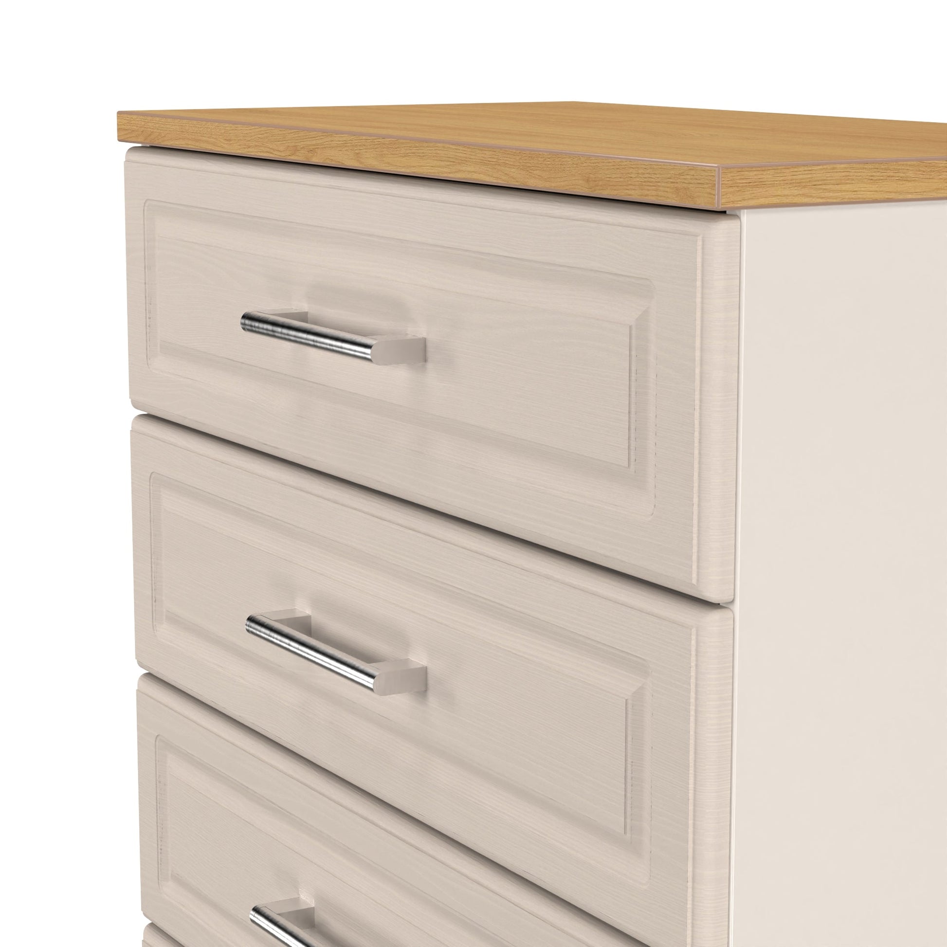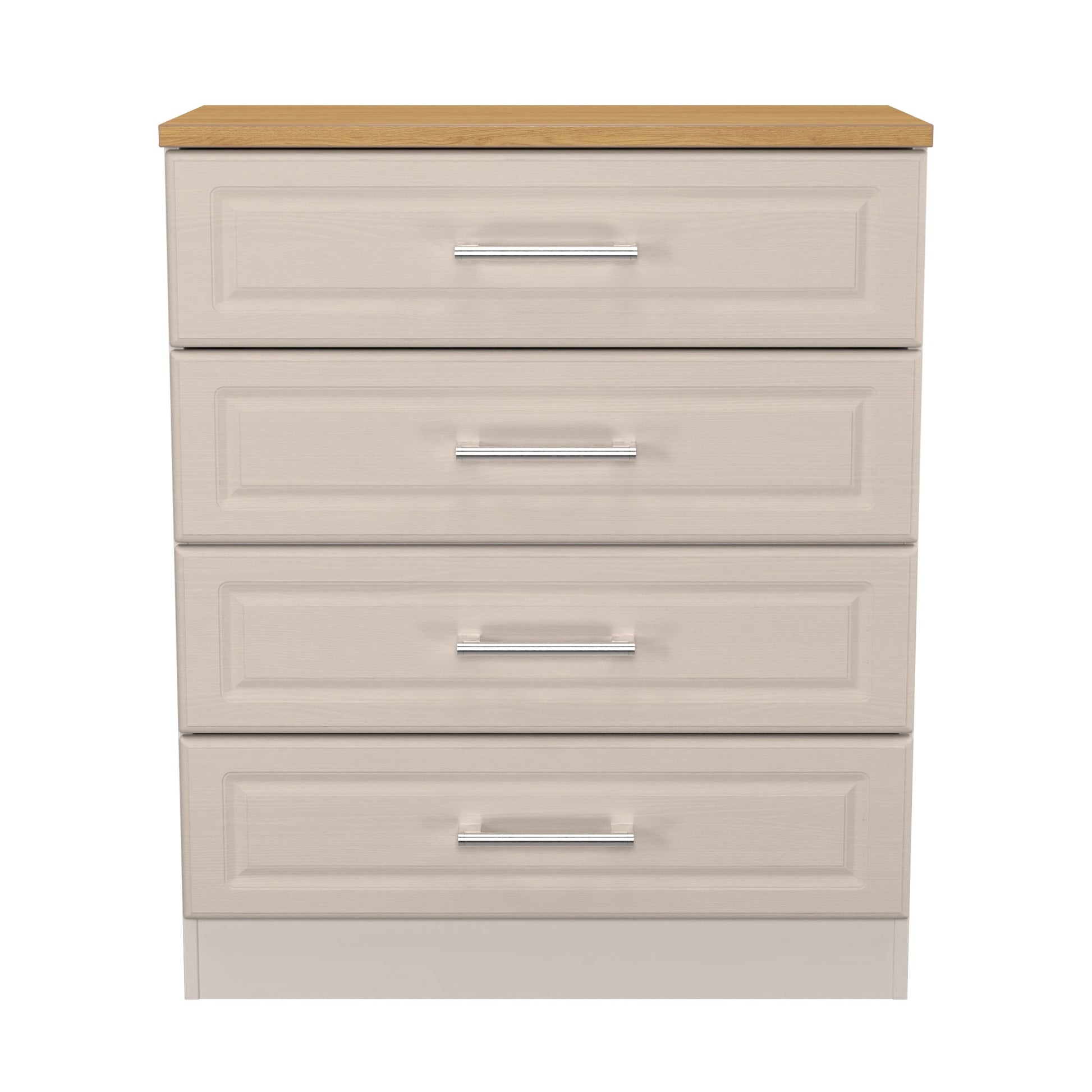 This wide 4 drawer chest of drawers is practical and stylish. Perfect for any home as a free standing storage unit. This iconic range uses traditional edge finishes and wood effect tops, to create a range of classic looking furniture pieces. Contrasting finishes create the tonal variations seen here with brushed steel handle mounted on wood grained fronts. All our furniture is made to order in the United Kingdom, to the highest quality. It is delivered within 10 working days direct to your location of choice by one of our two man delivery teams, and comes fully assembled (although legs may be removed to prevent damage in transit). Part of the Kent Collection.