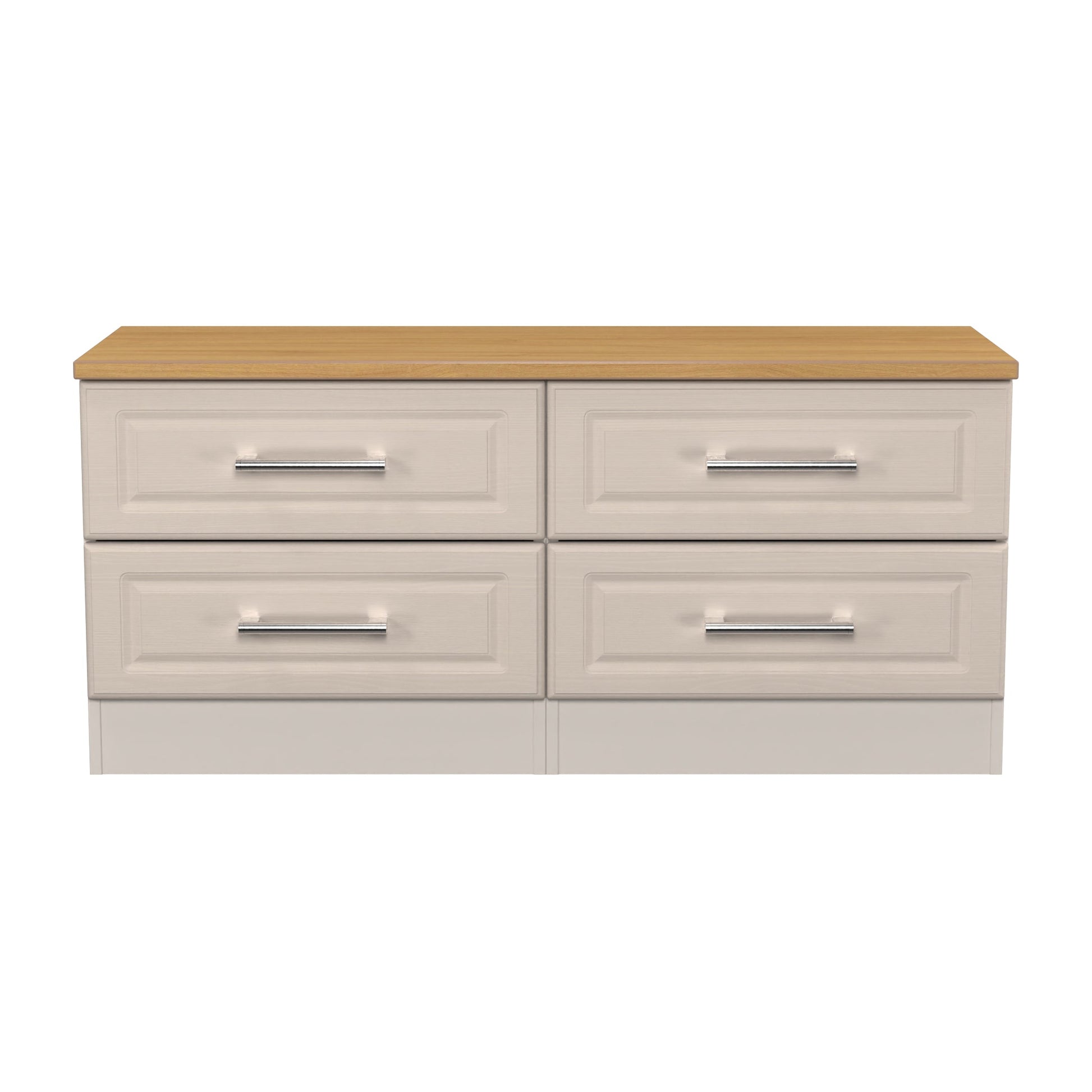 A large 4 drawer bed box. A Perfect storage solution for any room (not just the end of your bed). Could also be used as a low level TV/Media stand. This iconic range uses traditional edge finishes and wood effect tops, to create a range of classic looking furniture pieces. Contrasting finishes create the tonal variations seen here with brushed steel handle mounted on wood grained fronts. All our furniture is made to order in the United Kingdom, to the highest quality. It is delivered within 10 working days direct to your location of choice by one of our two man delivery teams, and comes fully assembled (although legs may be removed to prevent damage in transit). Part of the Kent Collection.