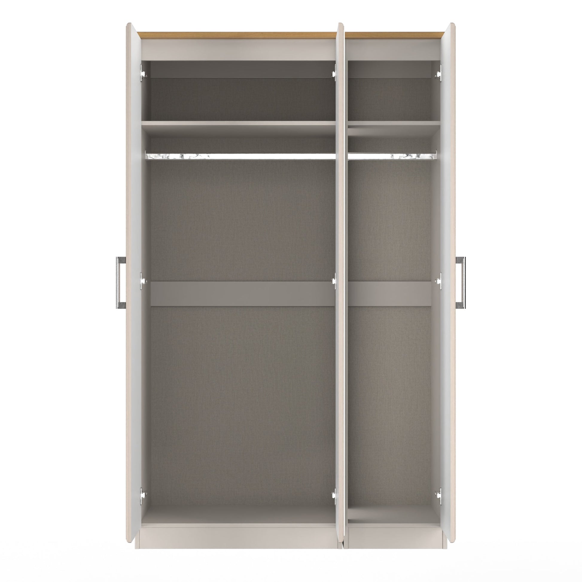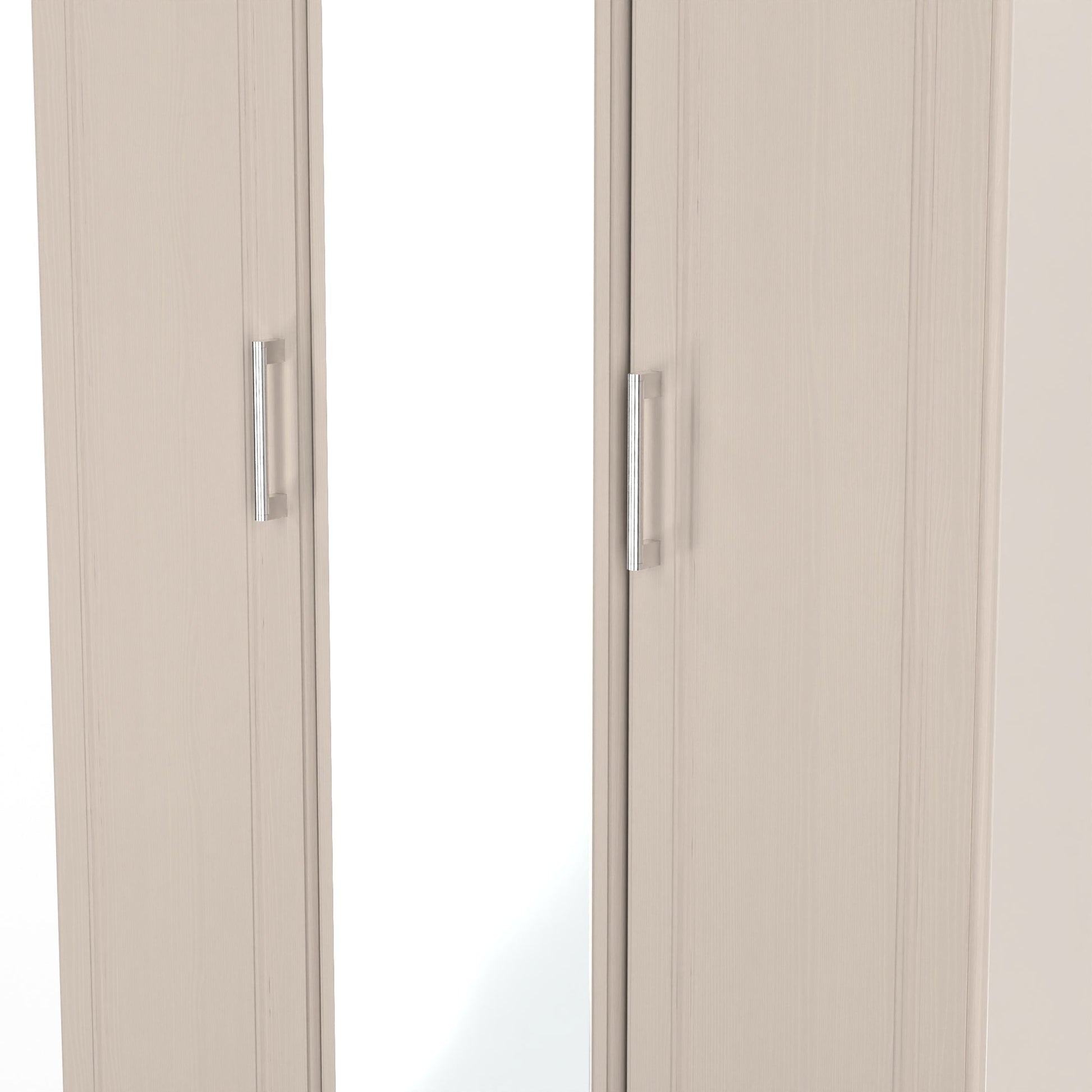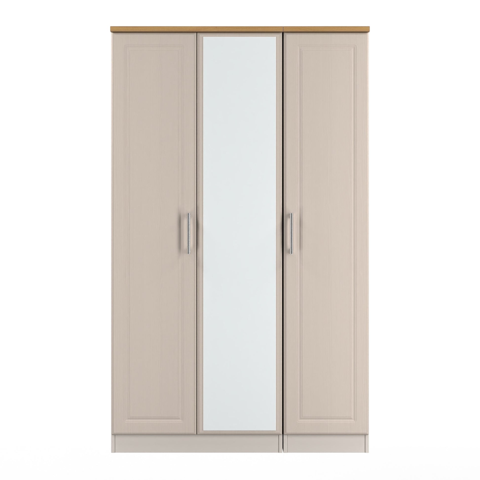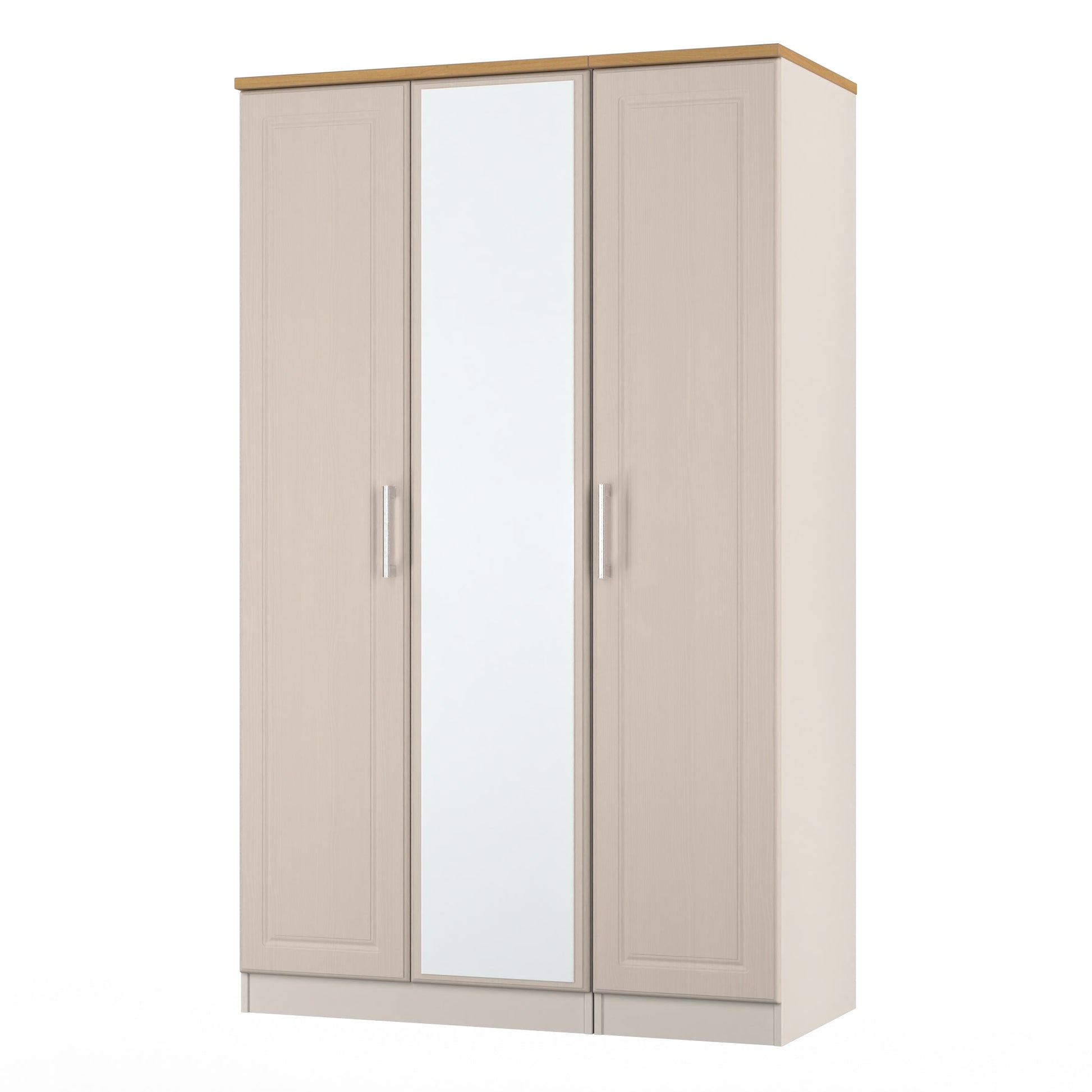 This full height triple 3 door wardrobe is perfect for any bedroom when a normal wardrobe is just not large enough. Also features a full height single mirrored door. This iconic range uses traditional edge finishes and wood effect tops, to create a range of classic looking furniture pieces. Contrasting finishes create the tonal variations seen here with brushed steel handle mounted on wood grained fronts. All our furniture is made to order in the United Kingdom, to the highest quality. It is delivered within 10 working days direct to your location of choice by one of our two man delivery teams, and comes fully assembled (although legs may be removed to prevent damage in transit). Part of the Kent Collection.