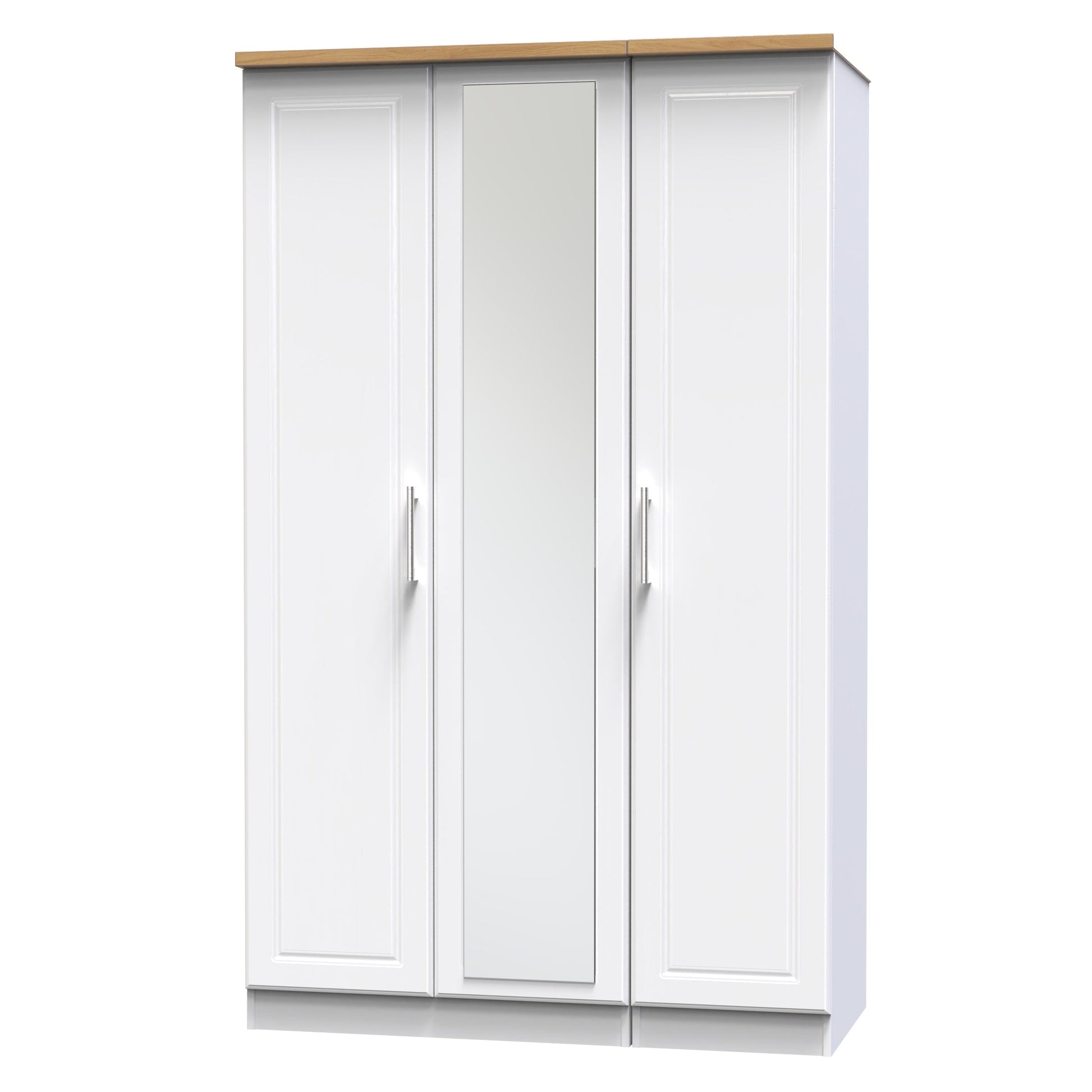 This full height triple 3 door wardrobe is perfect for any bedroom when a normal wardrobe is just not large enough. Also features a full height single mirrored door. This iconic range uses traditional edge finishes and wood effect tops, to create a range of classic looking furniture pieces. Contrasting finishes create the tonal variations seen here with brushed steel handle mounted on wood grained fronts. All our furniture is made to order in the United Kingdom, to the highest quality. It is delivered within 10 working days direct to your location of choice by one of our two man delivery teams, and comes fully assembled (although legs may be removed to prevent damage in transit). Part of the Kent Collection.