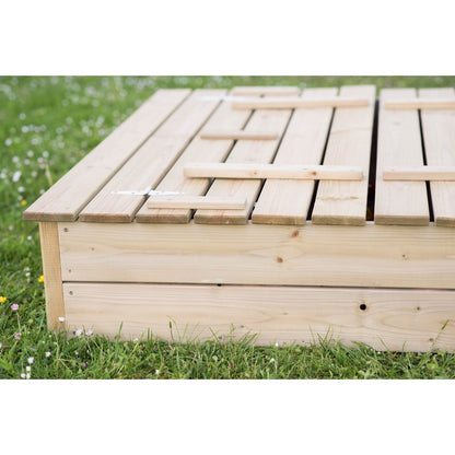 Square sandbox with lid and seats.Wooden sandbox is ideal for children to play in the garden and enjoy the outdoors.The lid can be easily transformed into a seat on one or both sides, for children's play in the sand.