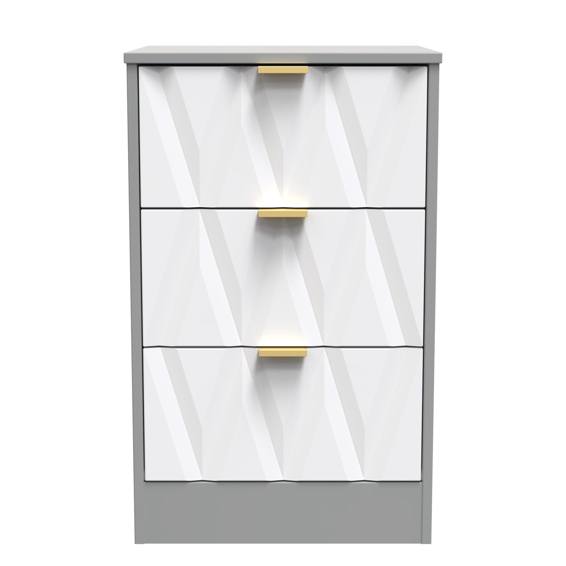 This 3 drawer bedside cabinet is practical and stylish. Perfect for any bedside or as a free standing storage unit. The distinctive front of this striking range combines a variety of colour options, with a choice of handles allowing it to compliment any interior design. Part of the Las Vegas F Collection.