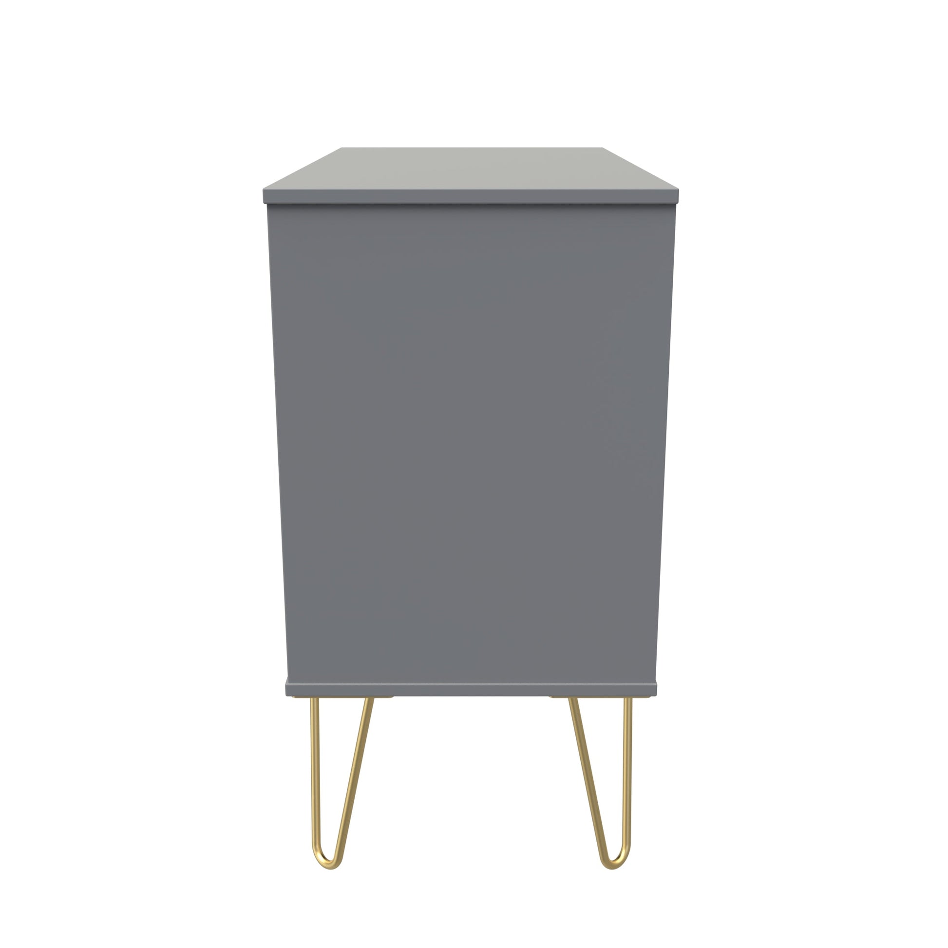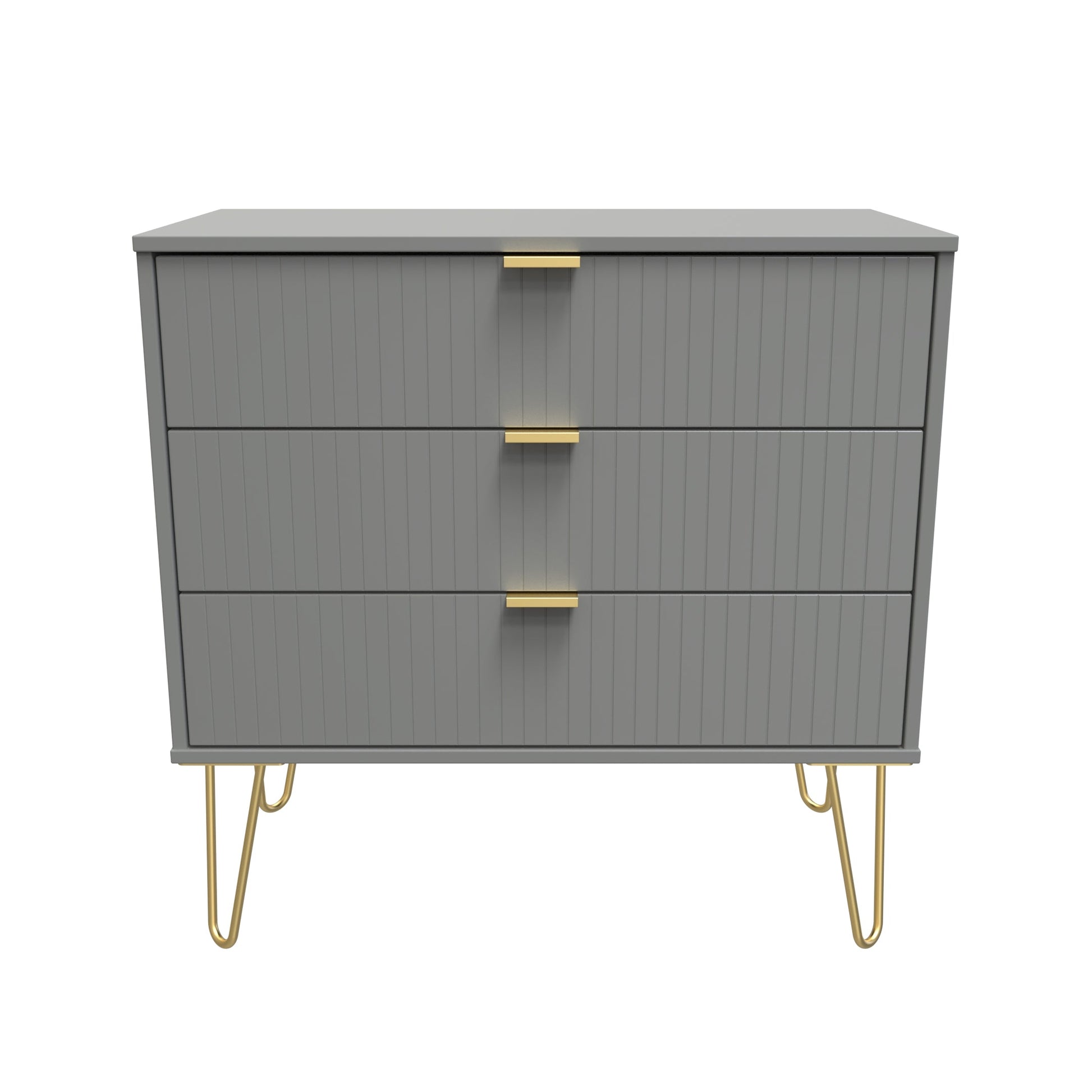 This wide 3 drawer chest of drawers is practical and stylish. Perfect for any home as a free standing storage unit. A modern and distinctive range. This ranges unique aesthetic is best represented by the distinctive "Linear" patten of the drawer and door fronts. Also features Gold Metal Handles and Gold Hairpin Legs. Comes in a wide range of colours including eye cathching two tone colour combinations. All our furniture is made to order in the United Kingdom, to the highest quality. It is delivered within 10 working days direct to your location of choice by one of our two man delivery teams, and comes fully assembled (although legs may be removed to prevent damage in transit). Part of the Linear Collection.