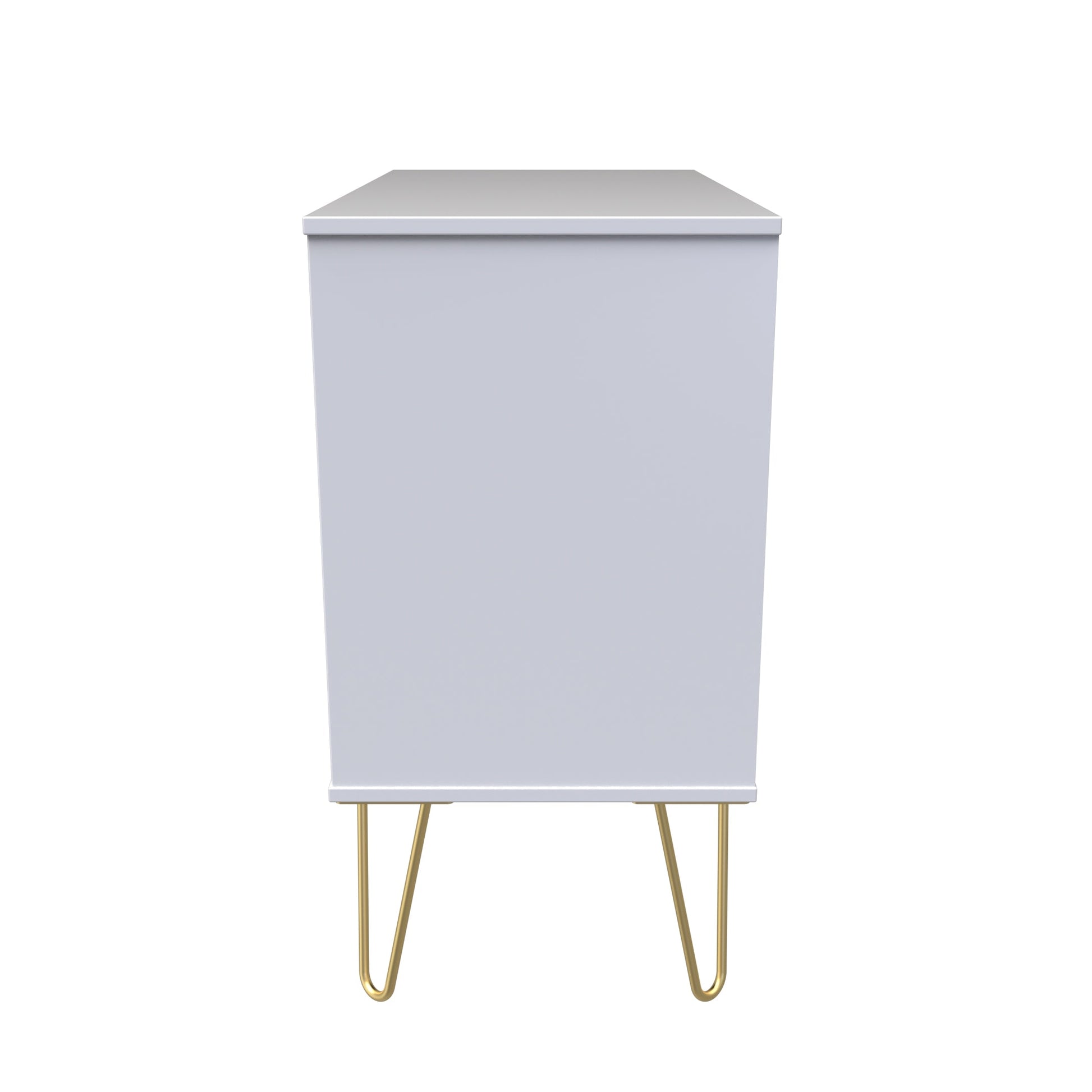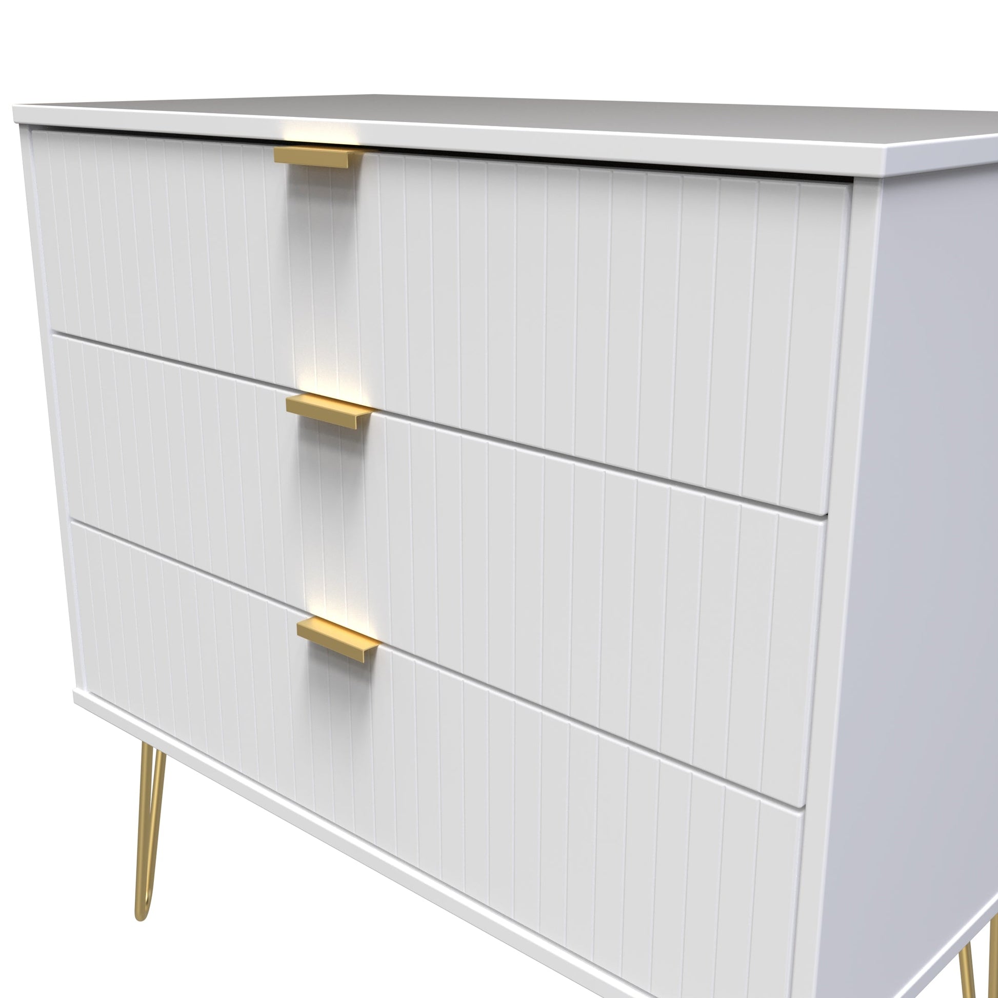 This wide 3 drawer chest of drawers is practical and stylish. Perfect for any home as a free standing storage unit. A modern and distinctive range. This ranges unique aesthetic is best represented by the distinctive "Linear" patten of the drawer and door fronts. Also features Gold Metal Handles and Gold Hairpin Legs. Comes in a wide range of colours including eye cathching two tone colour combinations. All our furniture is made to order in the United Kingdom, to the highest quality. It is delivered within 10 working days direct to your location of choice by one of our two man delivery teams, and comes fully assembled (although legs may be removed to prevent damage in transit). Part of the Linear Collection.