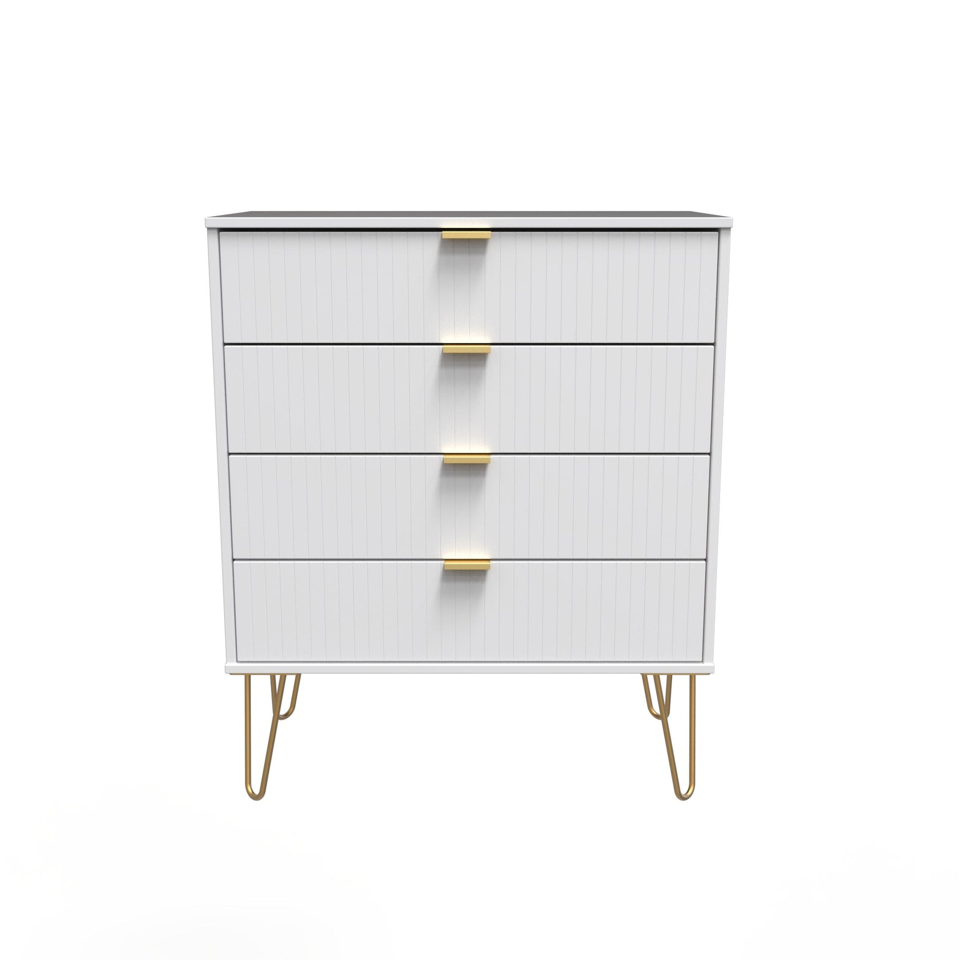 This wide 4 drawer chest of drawers is practical and stylish. Perfect for any home as a free standing storage unit. A modern and distinctive range. This ranges unique aesthetic is best represented by the distinctive "Linear" patten of the drawer and door fronts. Also features Gold Metal Handles and Gold Hairpin Legs. Comes in a wide range of colours including eye cathching two tone colour combinations. All our furniture is made to order in the United Kingdom, to the highest quality. It is delivered within 10 working days direct to your location of choice by one of our two man delivery teams, and comes fully assembled (although legs may be removed to prevent damage in transit). Part of the Linear Collection.