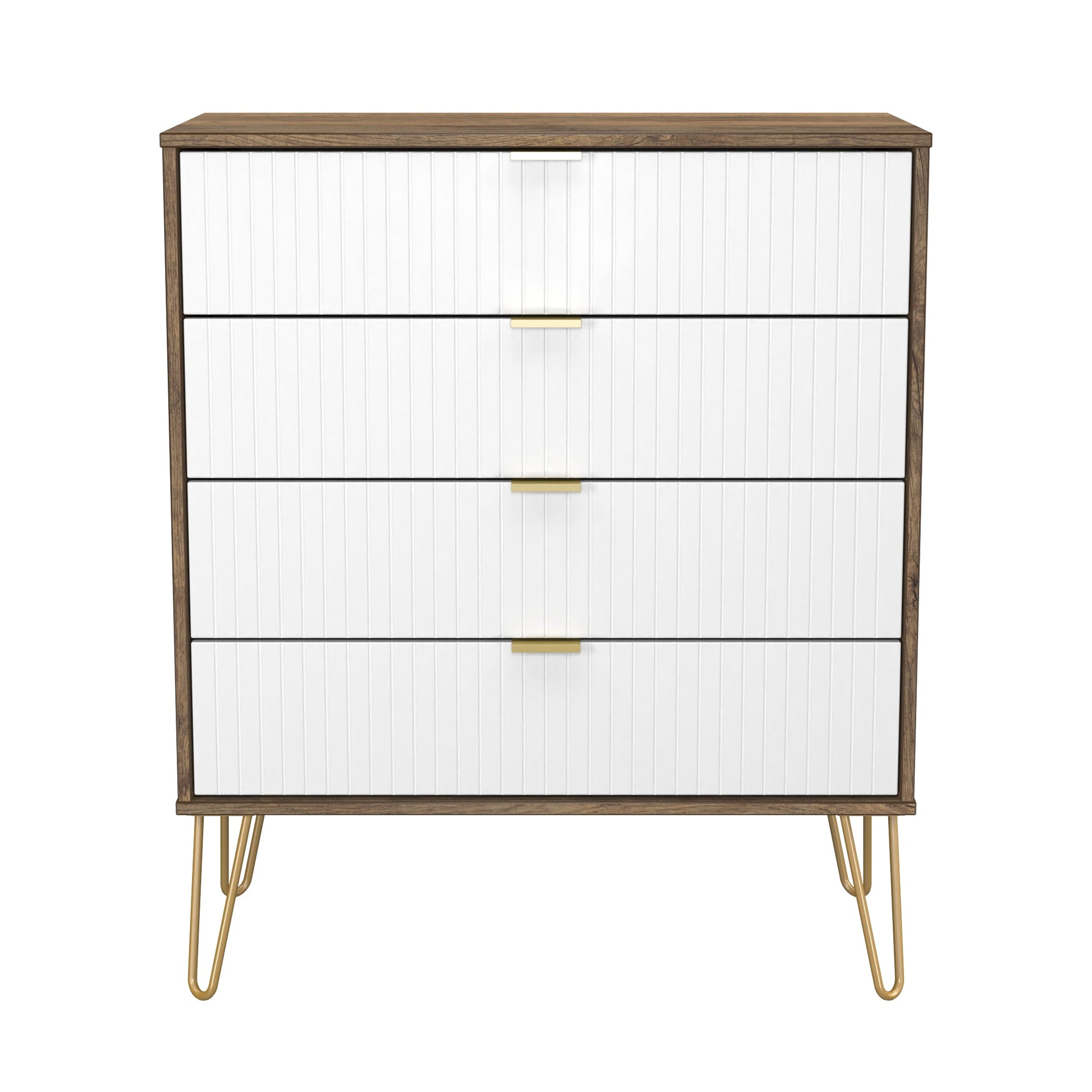 This wide 4 drawer chest of drawers is practical and stylish. Perfect for any home as a free standing storage unit. A modern and distinctive range. This ranges unique aesthetic is best represented by the distinctive "Linear" patten of the drawer and door fronts. Also features Gold Metal Handles and Gold Hairpin Legs. Comes in a wide range of colours including eye cathching two tone colour combinations. All our furniture is made to order in the United Kingdom, to the highest quality. It is delivered within 10 working days direct to your location of choice by one of our two man delivery teams, and comes fully assembled (although legs may be removed to prevent damage in transit). Part of the Linear Collection.