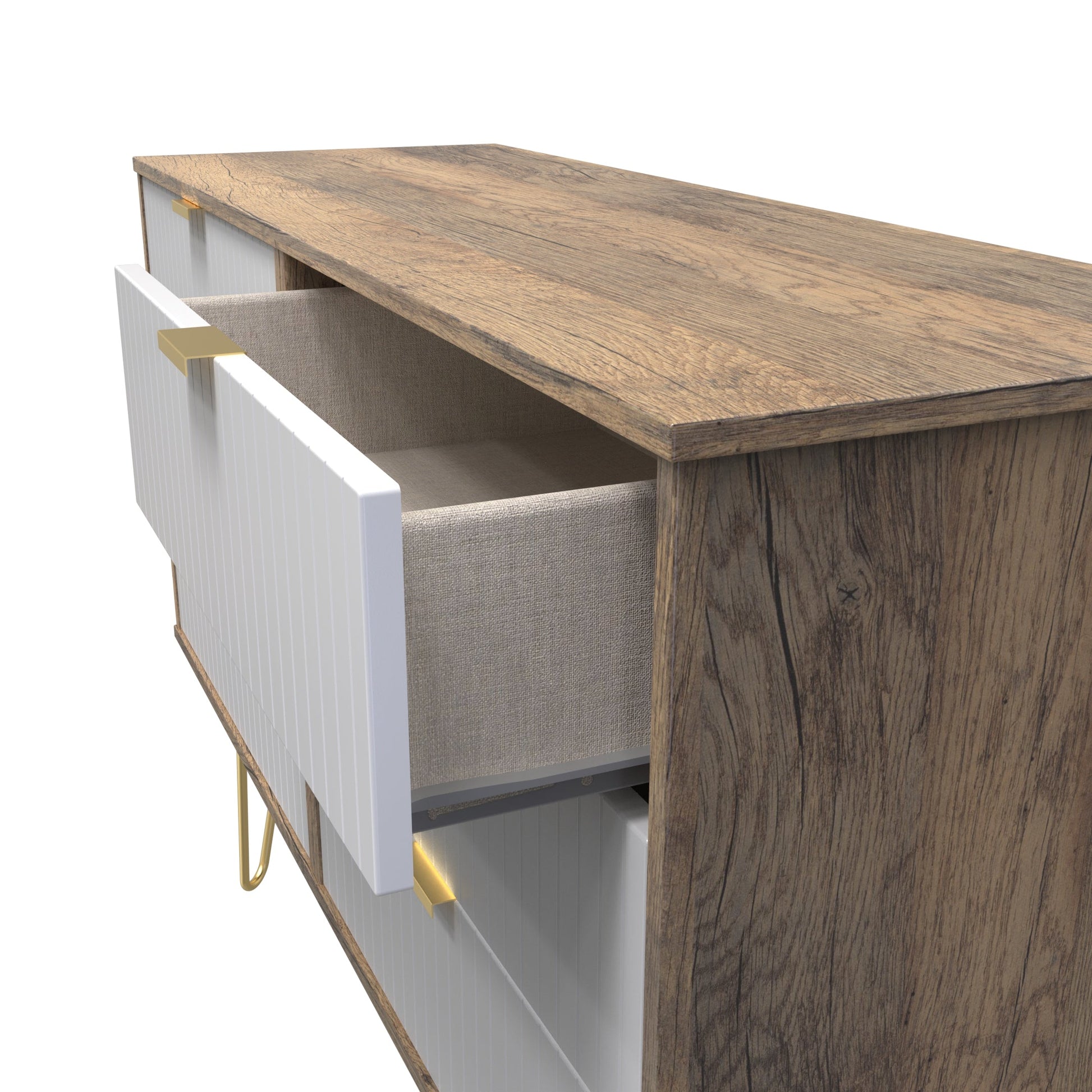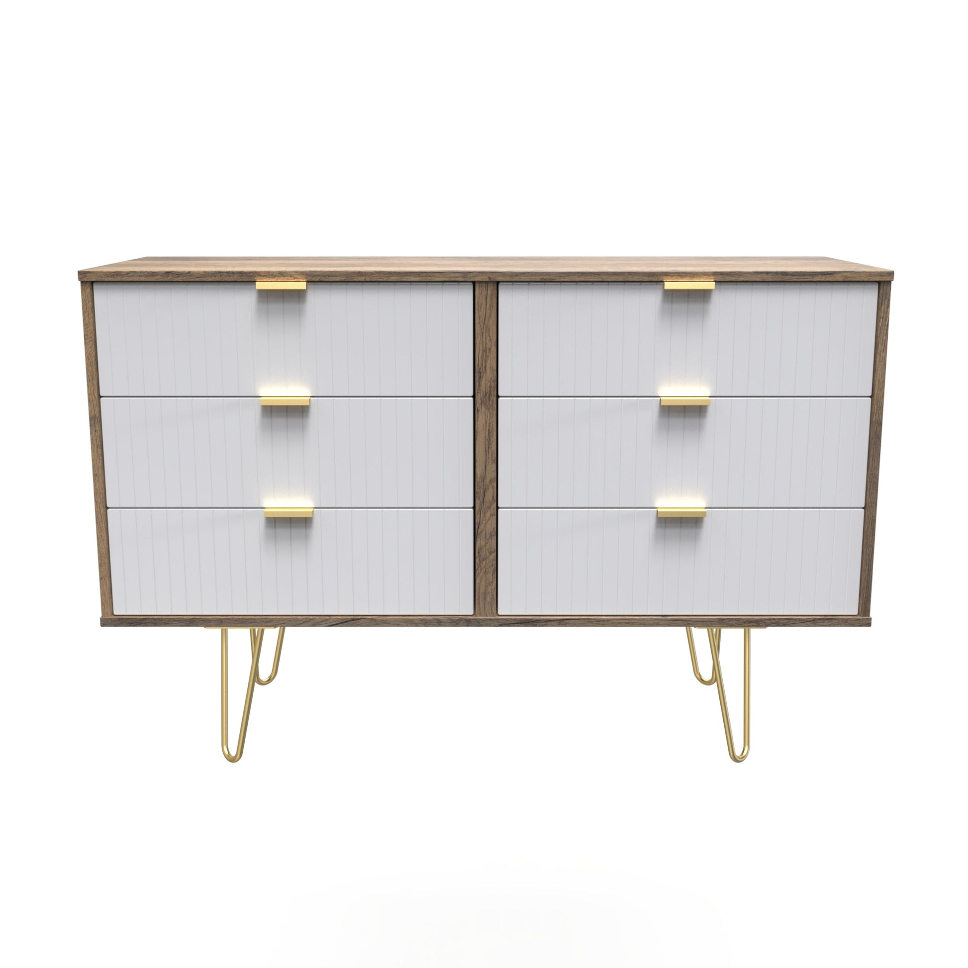 This double width 6 drawer chest of drawers is practical and stylish. Perfect for any home as a free standing storage unit. A modern and distinctive range. This ranges unique aesthetic is best represented by the distinctive "Linear" patten of the drawer and door fronts. Also features Gold Metal Handles and Gold Hairpin Legs. Comes in a wide range of colours including eye cathching two tone colour combinations. All our furniture is made to order in the United Kingdom, to the highest quality. It is delivered within 10 working days direct to your location of choice by one of our two man delivery teams, and comes fully assembled (although legs may be removed to prevent damage in transit). Part of the Linear Collection.