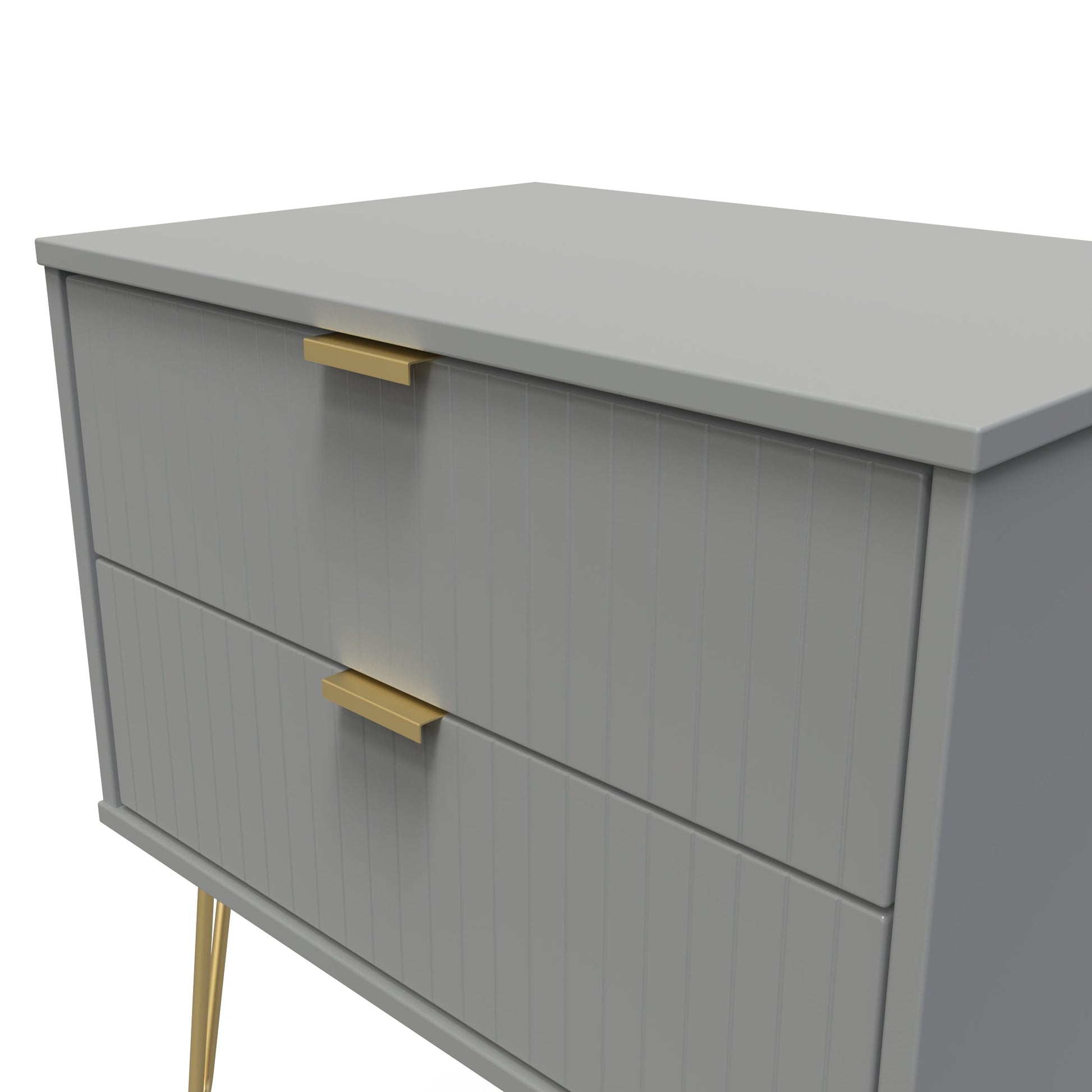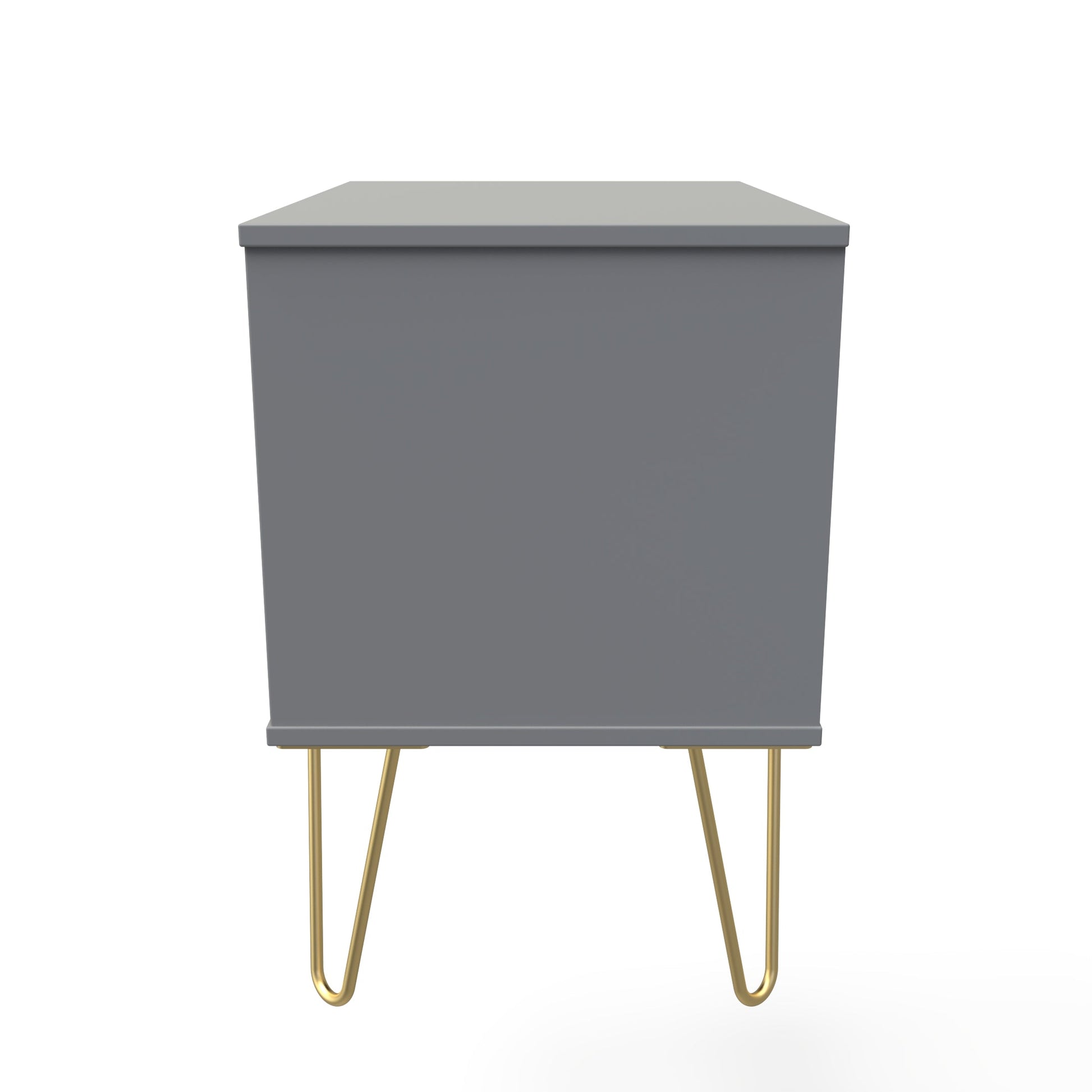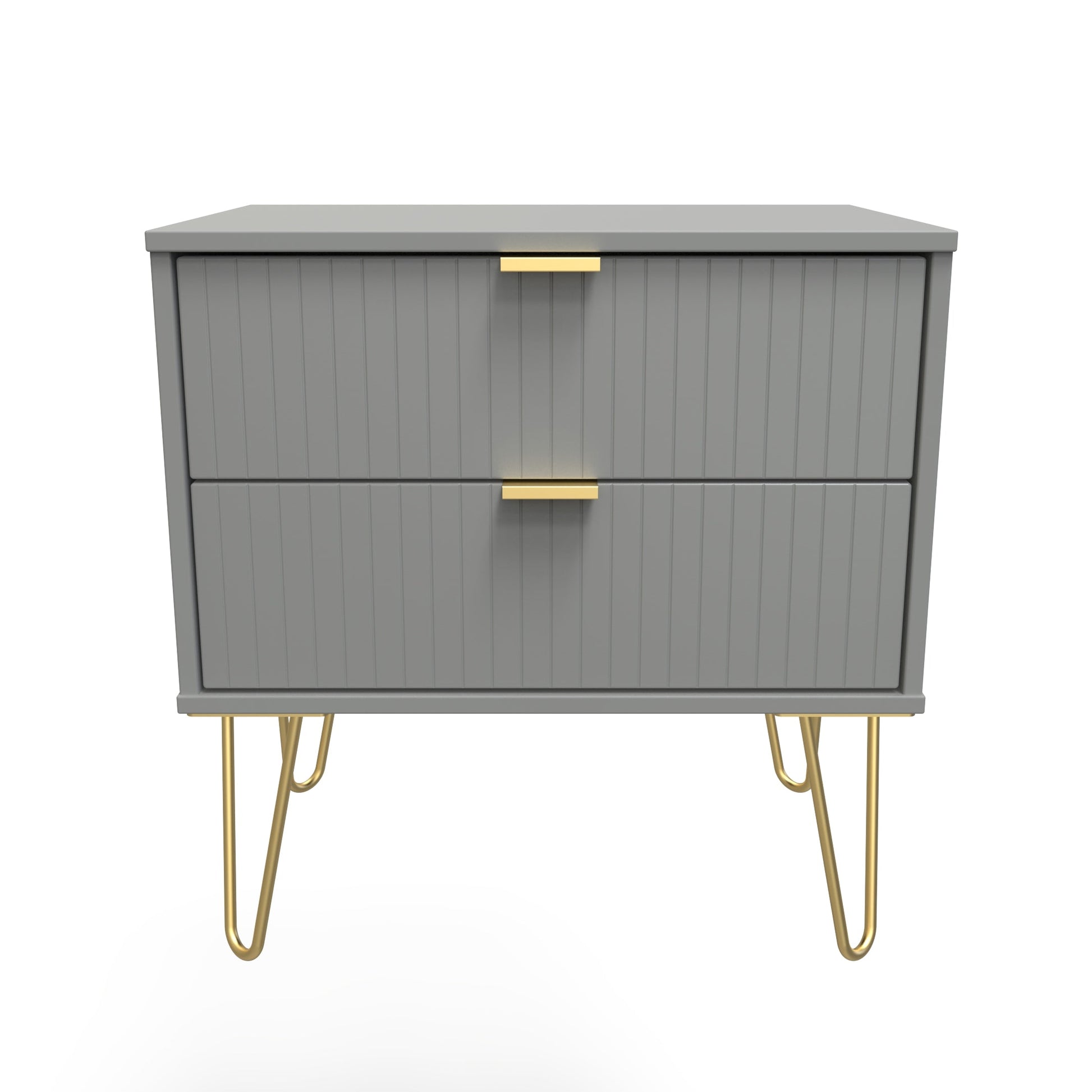 This 2 drawer bedside cabinet is wider than normal for added practicality. Perfect for any bedside or as a free standing storage unit. A modern and distinctive range. This ranges unique aesthetic is best represented by the distinctive "Linear" patten of the drawer and door fronts. Also features Gold Metal Handles and Gold Hairpin Legs. Comes in a wide range of colours including eye cathching two tone colour combinations. All our furniture is made to order in the United Kingdom, to the highest quality. It is delivered within 10 working days direct to your location of choice by one of our two man delivery teams, and comes fully assembled (although legs may be removed to prevent damage in transit). Part of the Linear Collection.
