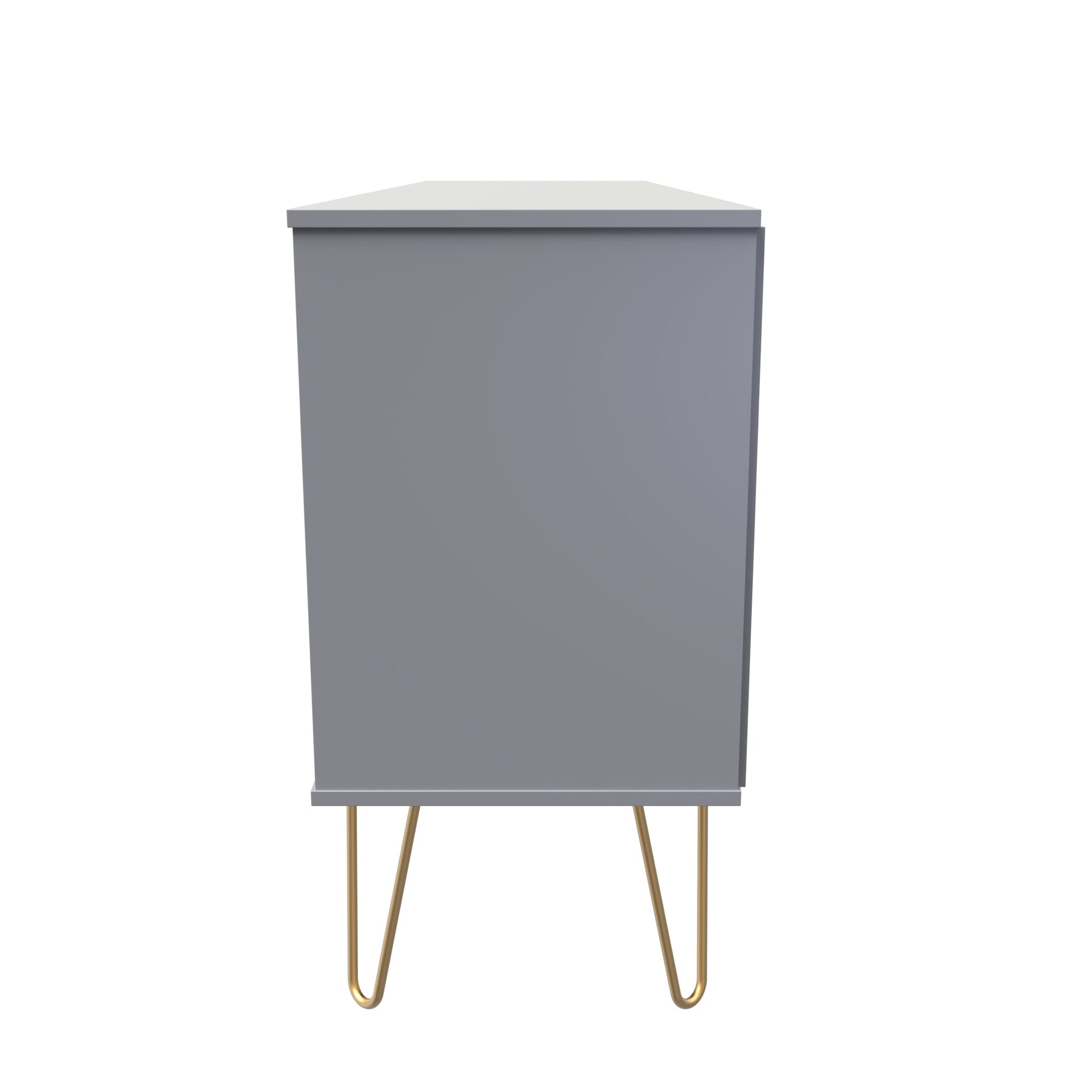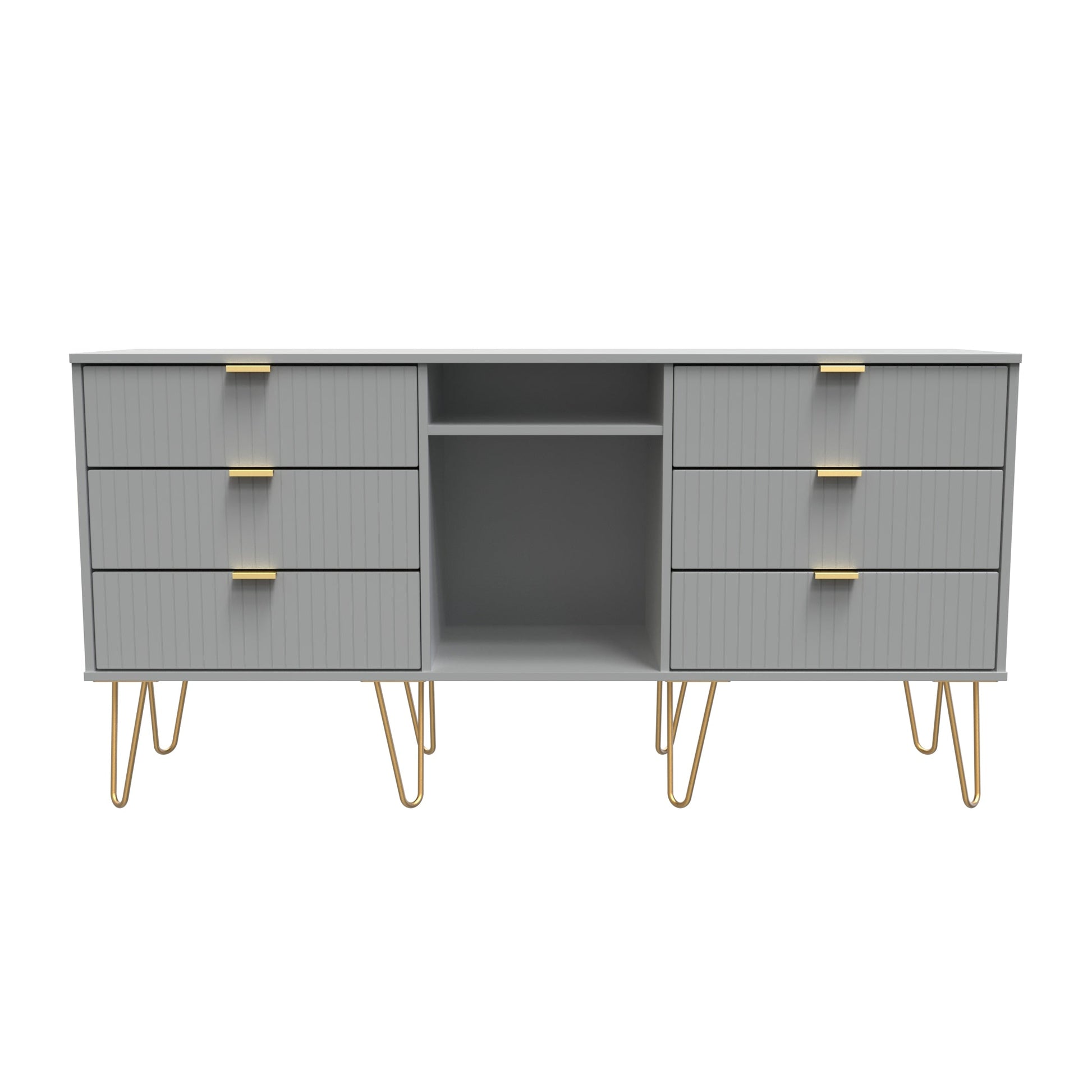 This wide storage unit features 6 storage drawers with a central shelf. Suitable for use as a TV/Media unit or sideboard. A modern and distinctive range. This ranges unique aesthetic is best represented by the distinctive "Linear" patten of the drawer and door fronts. Also features Gold Metal Handles and Gold Hairpin Legs. Comes in a wide range of colours including eye cathching two tone colour combinations. All our furniture is made to order in the United Kingdom, to the highest quality. It is delivered within 10 working days direct to your location of choice by one of our two man delivery teams, and comes fully assembled (although legs may be removed to prevent damage in transit). Part of the Linear Collection.