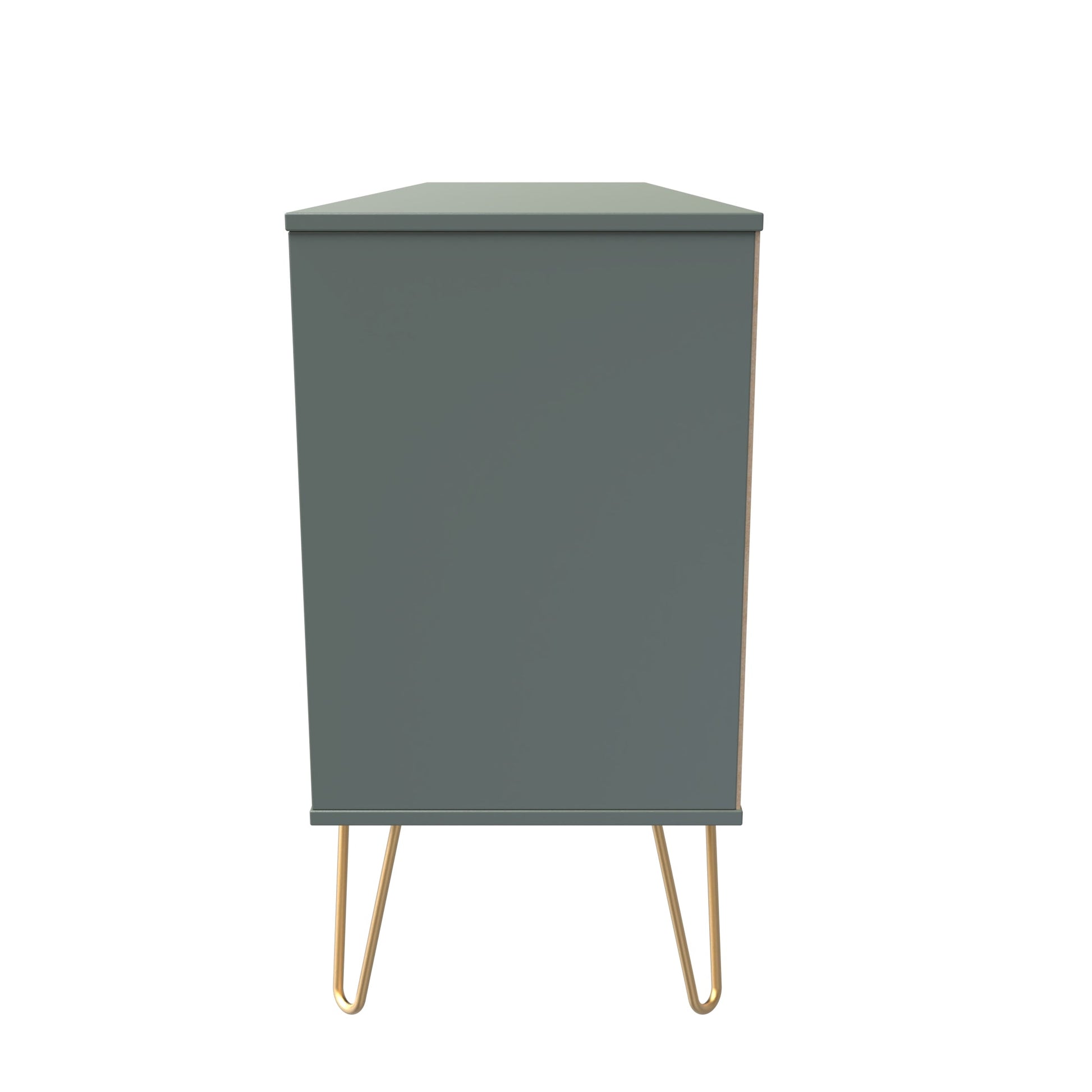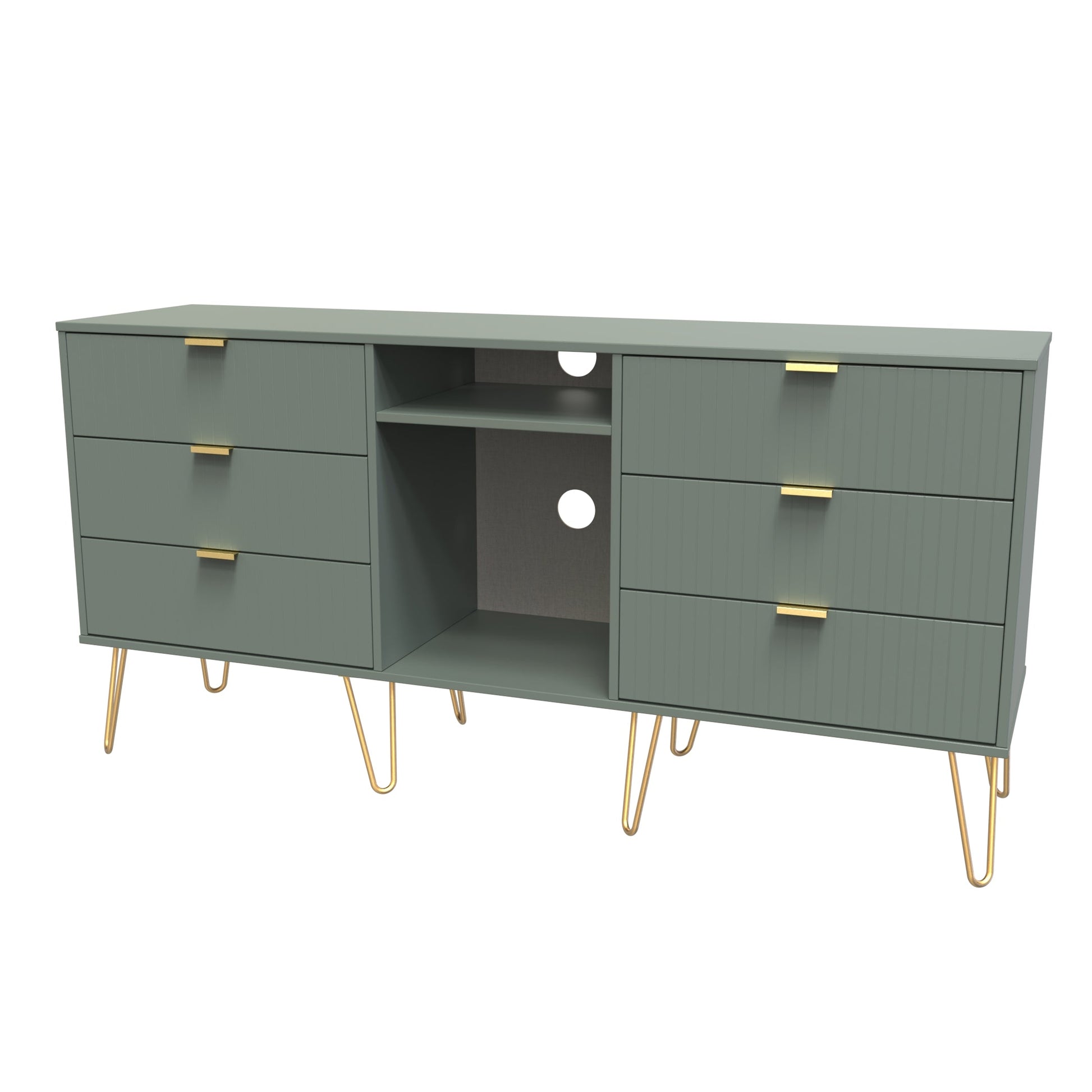 This wide storage unit features 6 storage drawers with a central shelf. Suitable for use as a TV/Media unit or sideboard. A modern and distinctive range. This ranges unique aesthetic is best represented by the distinctive "Linear" patten of the drawer and door fronts. Also features Gold Metal Handles and Gold Hairpin Legs. Comes in a wide range of colours including eye cathching two tone colour combinations. All our furniture is made to order in the United Kingdom, to the highest quality. It is delivered within 10 working days direct to your location of choice by one of our two man delivery teams, and comes fully assembled (although legs may be removed to prevent damage in transit). Part of the Linear Collection.