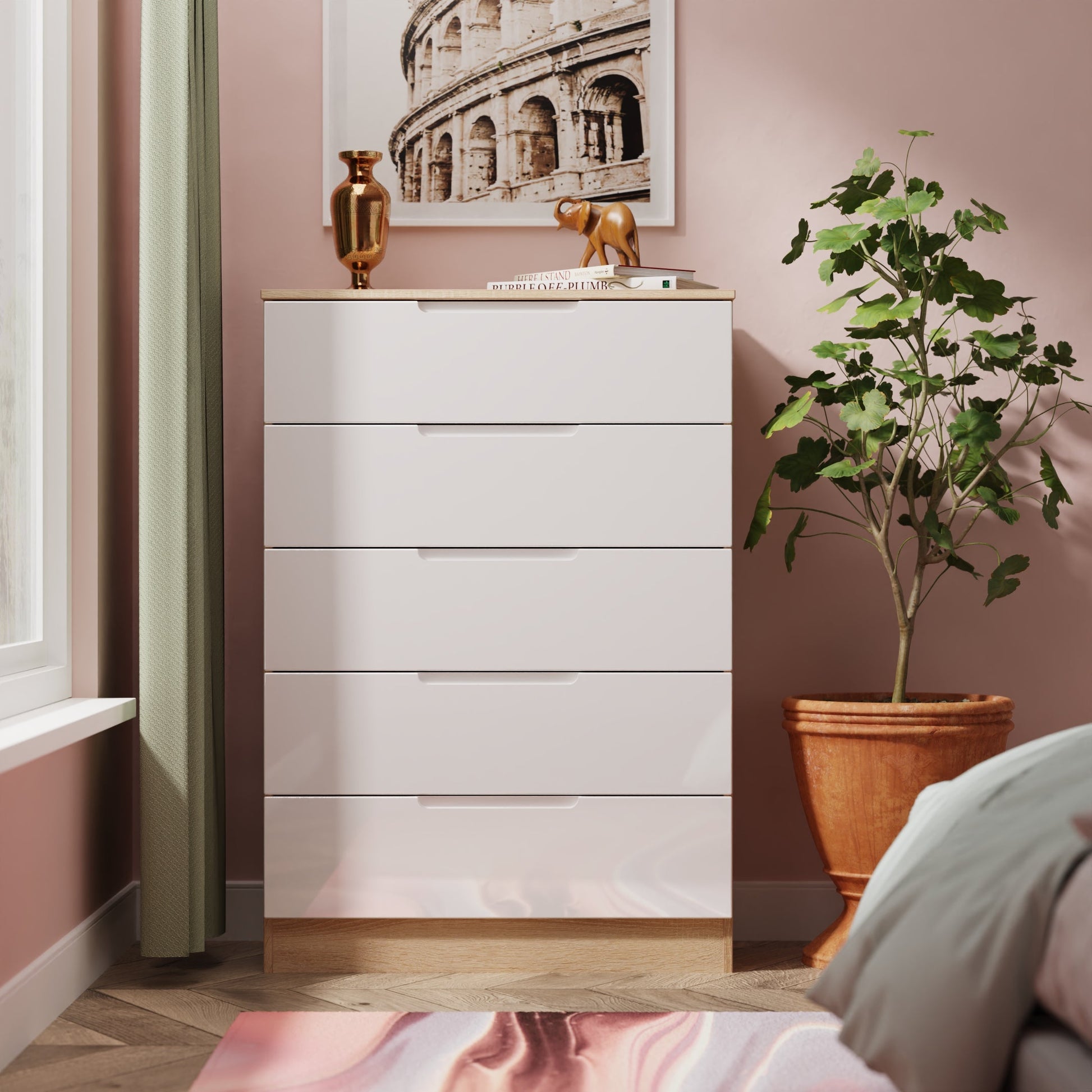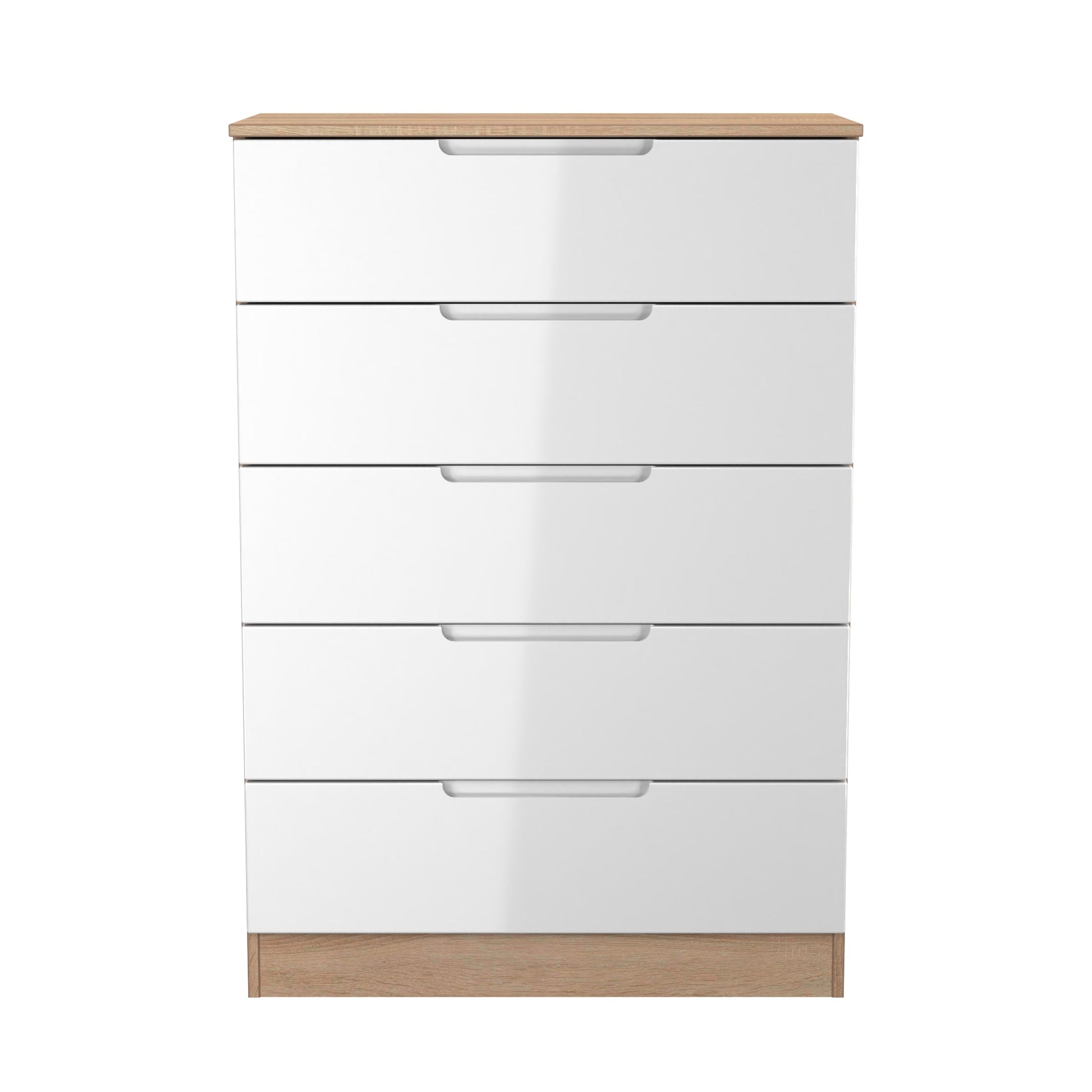 Milan Tall Chest of Drawers White & Oak 5 Drawers 108cm