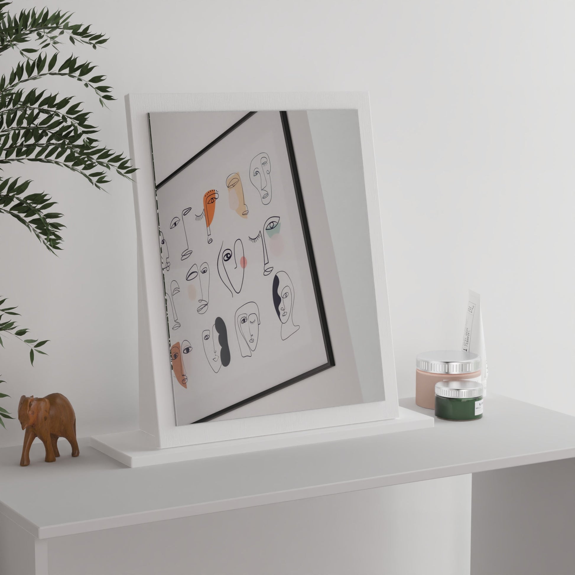 A small angled freestanding mirror with a framed edge. Ideal for any vanity unit or free standing atop a chest of drawers. This classic range uses traditional edge finishes and wood effect tops, to create a range of classic looking furniture pieces. Contrasting finishes create the tonal variations seen here with brushed steel handle mounted on wood grained fronts. All our furniture is made to order in the United Kingdom, to the highest quality. It is delivered within 10 working days direct to your location of choice by one of our two man delivery teams, and comes fully assembled - Please Note that any handles or legs may be removed durning transit to avoid the risk of damage. Part of the Norfolk Collection.