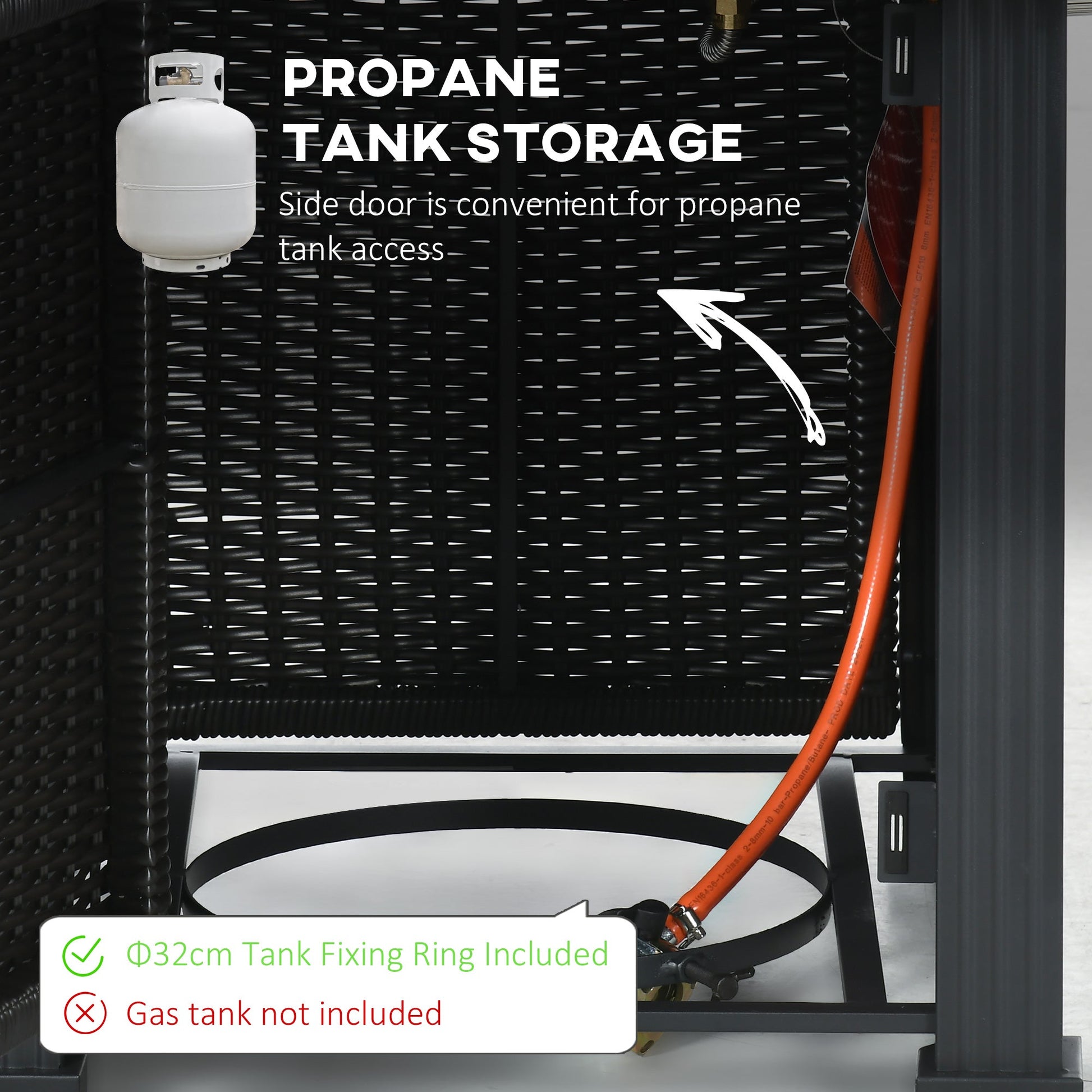 Enjoy garden warmth and ambiance all year-round with this Outsunny fire pit table. Rattan design is stylish, looks great matched with other furniture. The tabletop is fitted with a centre fire pit - the 50,000 BTU burner is powerful and produces a clean smokeless burn. The flame can be adjusted too. The thermocouple closes the valve if the flame goes out for safety - no leaking gas. Complete with a glass guard, protecting against flying sparks.