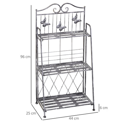 Add style and storage to your home with this charming tiered plant stand from Outsunny. This 3-tiered plant rack is built with a gorgeous sturdy metal scrollwork frame, which brings a touch of elegance to your porch, patio, interior space or wherever you want to utilize it. It is perfect for holding everything from books to decorative candles. Easy to fold down and store in the corner space when not in use. With this smart gadget, you can easily keep your surrounding area neat and tidy!