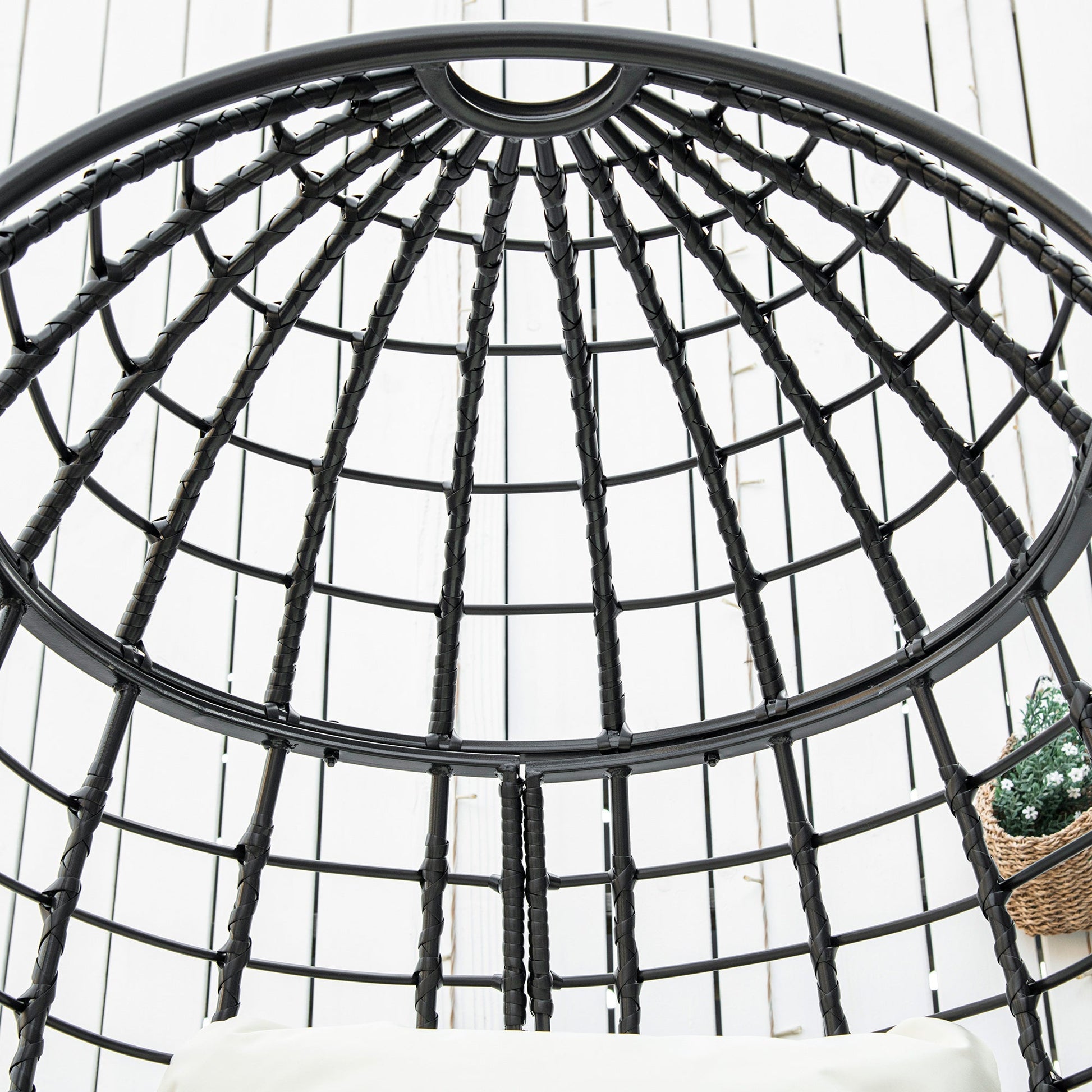 Powder coated steel frame for a strong core, wrapped in protective wicker rattan