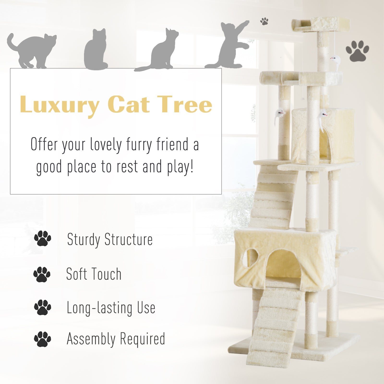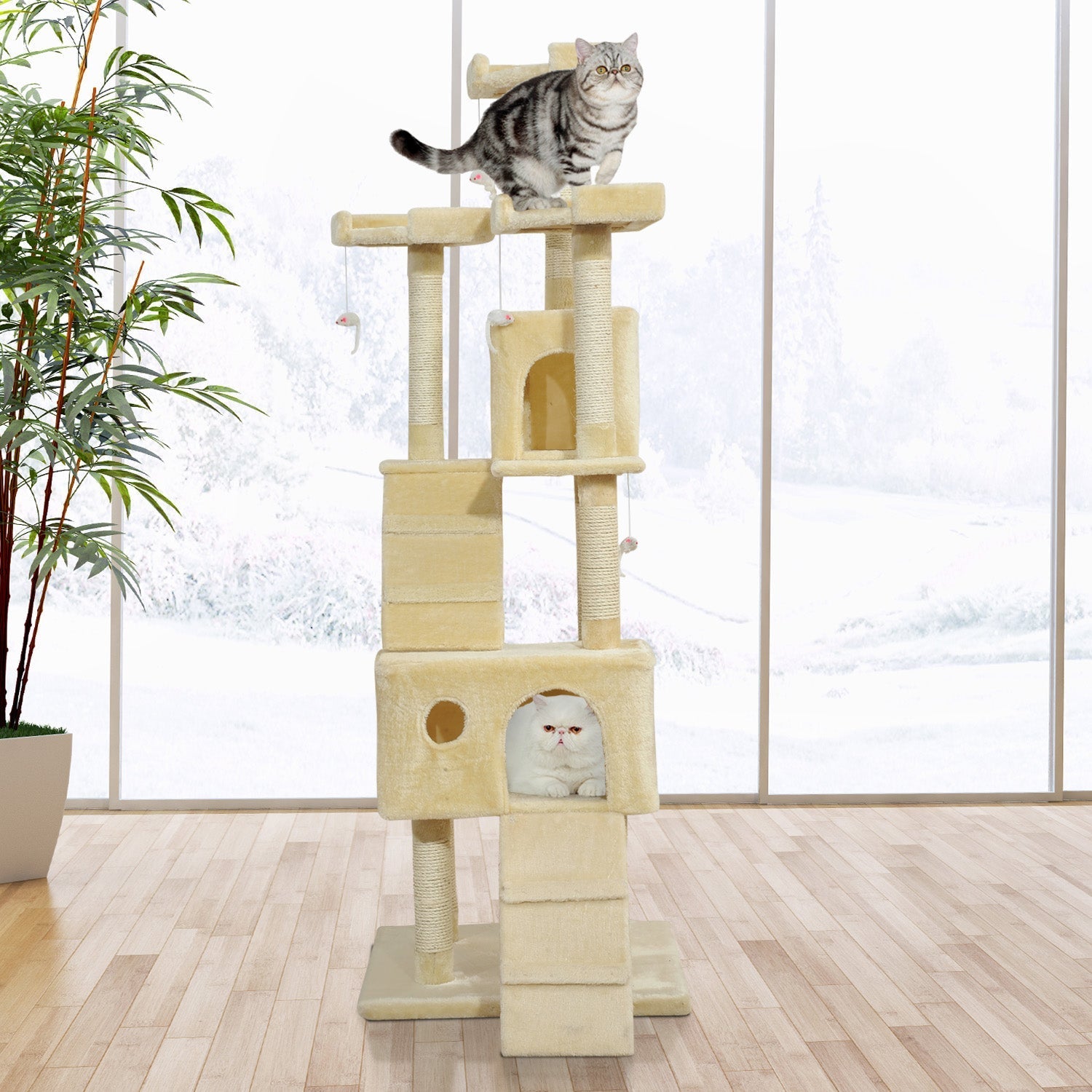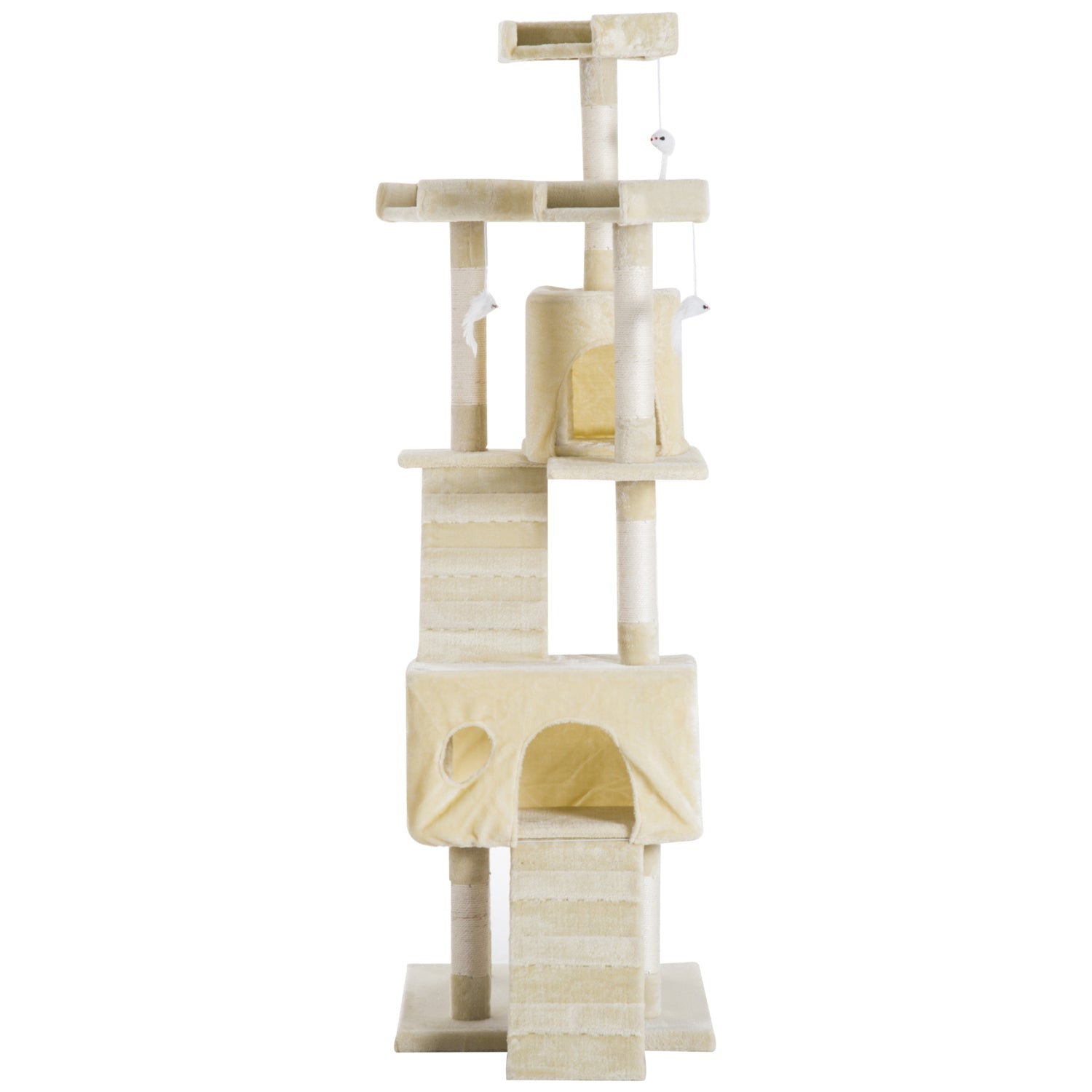 Satisfy your cat's natural instincts in a safe way with this cat tree from PawHut! This multi-activity center features natural sisal covered scratching posts, teasing ball toy, roomy condos and perches. Cat scratcher benefit both pet and owners by providing someplace to relieve cats’ desire to claw and to climb and saving your carpets and household furniture from damage. Rest, play, exercise, your cats can spend all day on it. Keep your kitten happy and your home safe with this deluxe climbable cat tree exploration center!