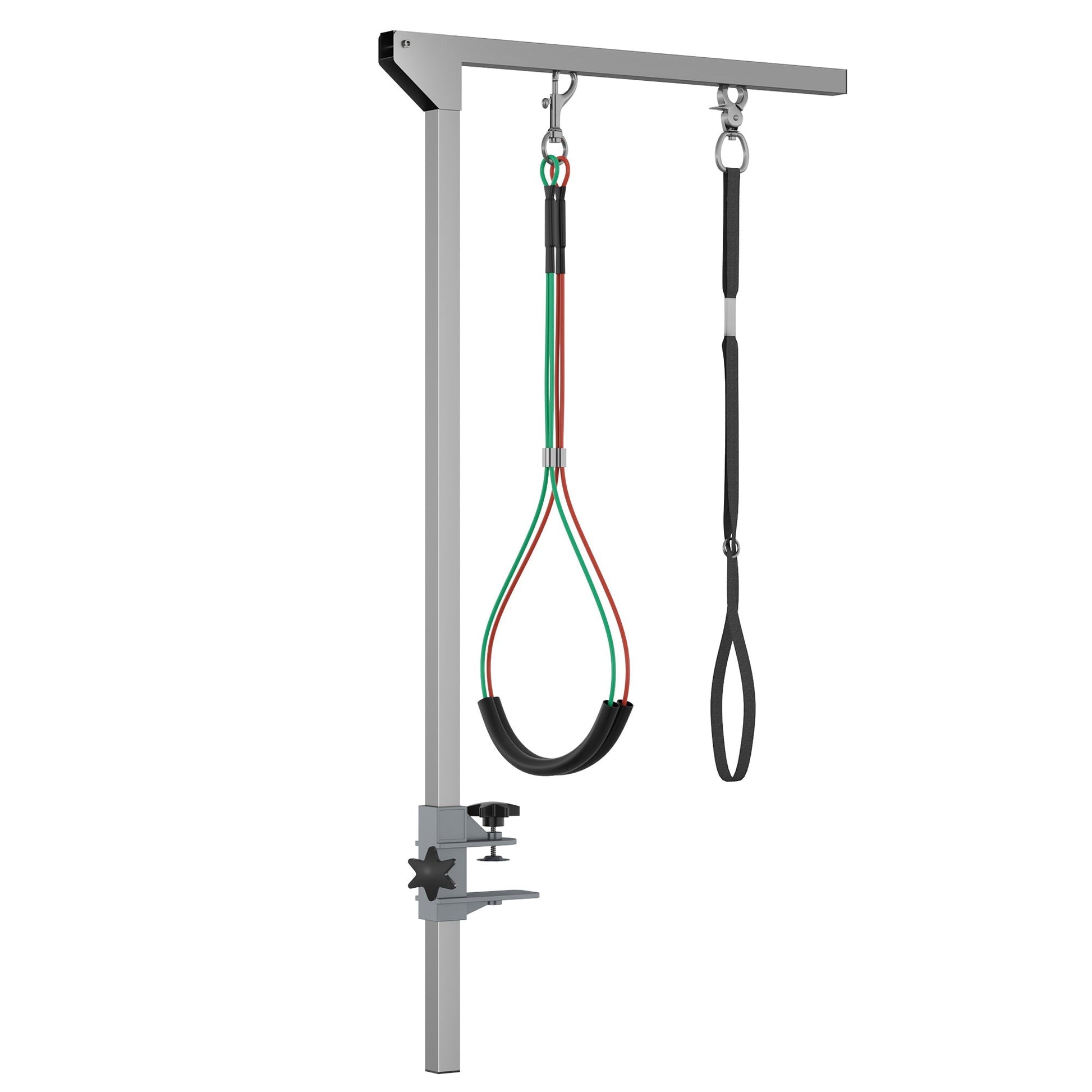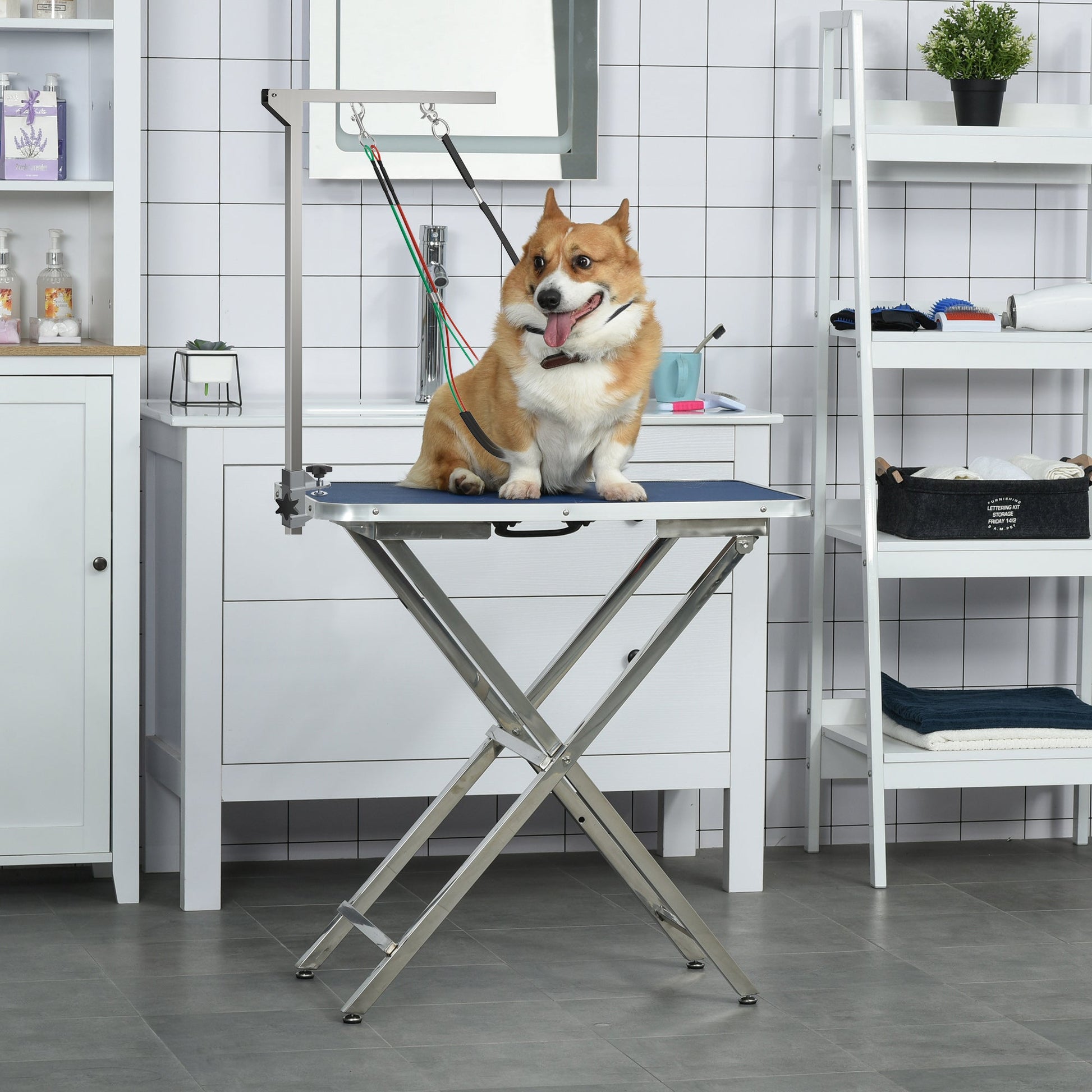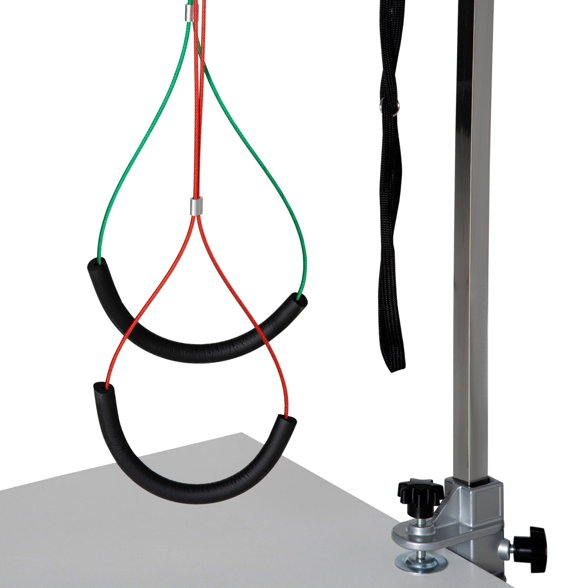 - Haunch holders and grooming loop attached to adjustable height bar for different-sized dogs