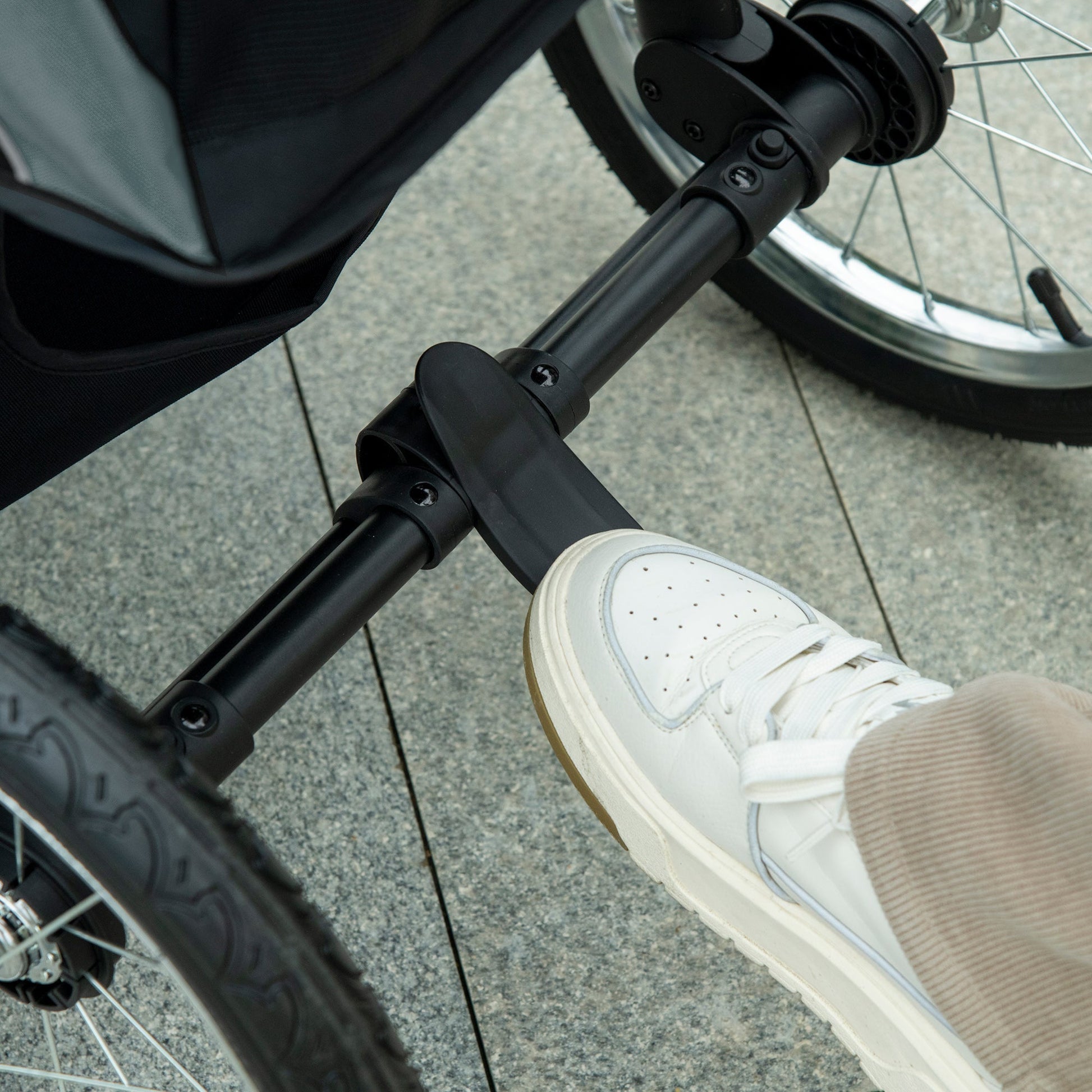 Safety leashes, reflective strips and a rear footbrake, providing safety and security