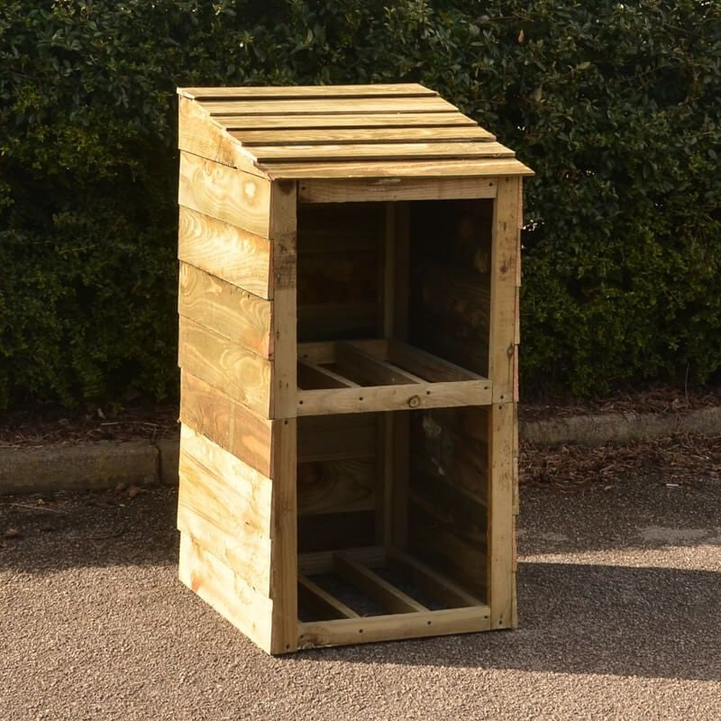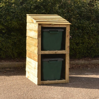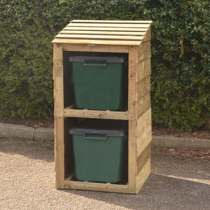 High Quality Outdoor Recycling Bin Storage The ultimate deluxe personalised wooden recycling storage. Keep your recycling bins tidy with this wooden storage shed for 2 recycling bins. Made from tanalised pine wood that is pressure treated against rot. This bin will be an attractive addition to your garden for a long time to come.