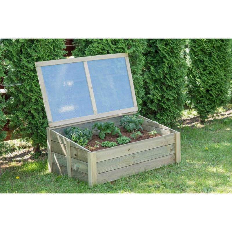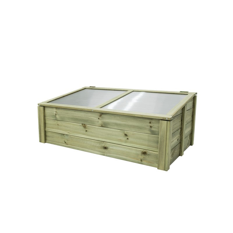 The Wooden Cold Frame is an ideal product to nurture seedlings outdoors and also protect plants from the elements and colder temperatures. A useful feature is a hinge to prop the roof open whilst working in the frame whilst the polycarbonate roof keeps the unit watertight once shut. All timber within the cold frame is FSC certified and pressure-treated in a natural green finish, protecting the product from wood rot and fungal decay.