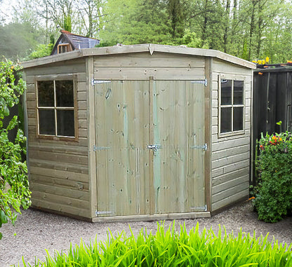 This pressure treated Corner Shed has double doors that provide excellent access and the building is fitted with 2 opening joinery made windows. The roof is constructed from solid board (OSB) for ease of installation and the floor is tongue and groove timber. This product is part of the Corner collection.