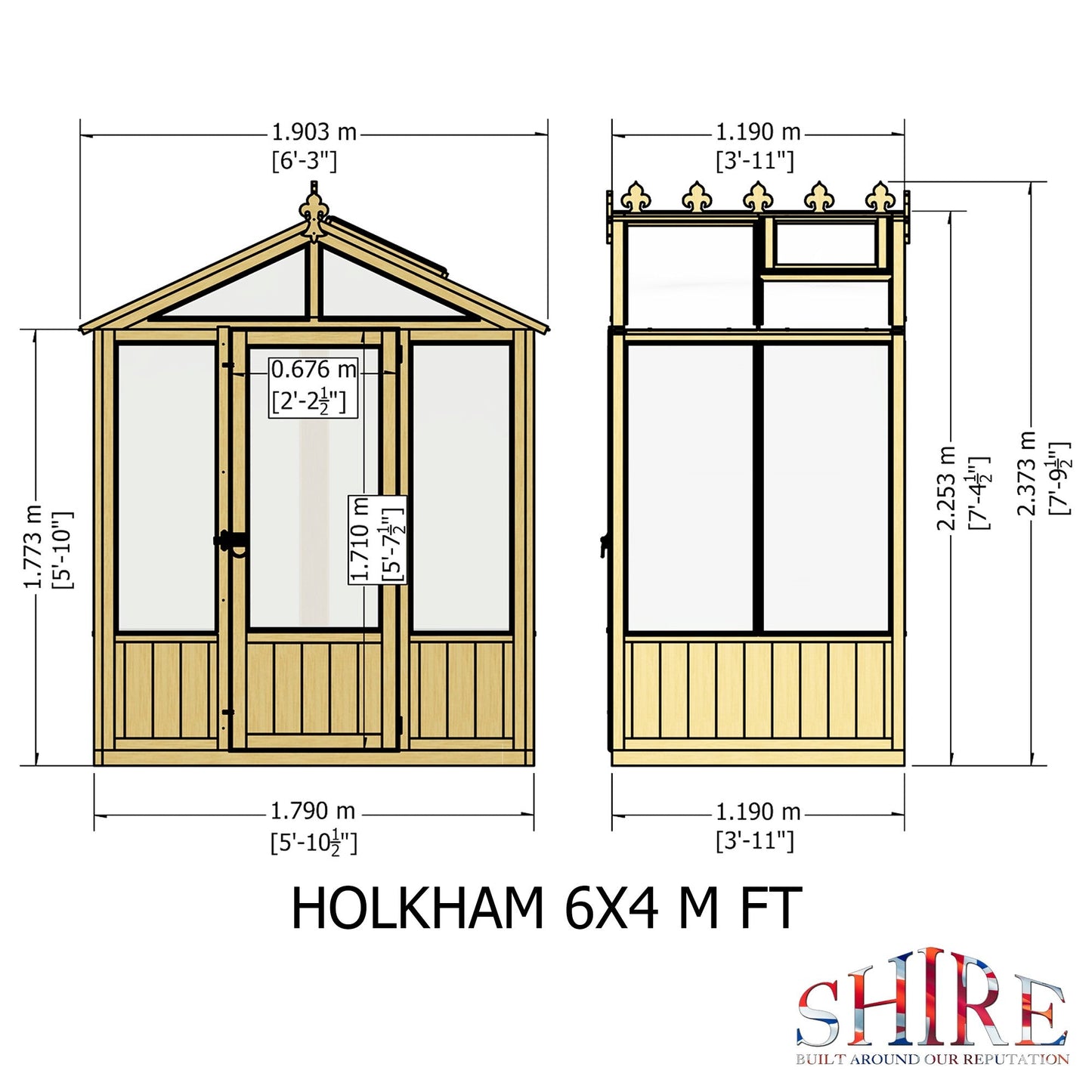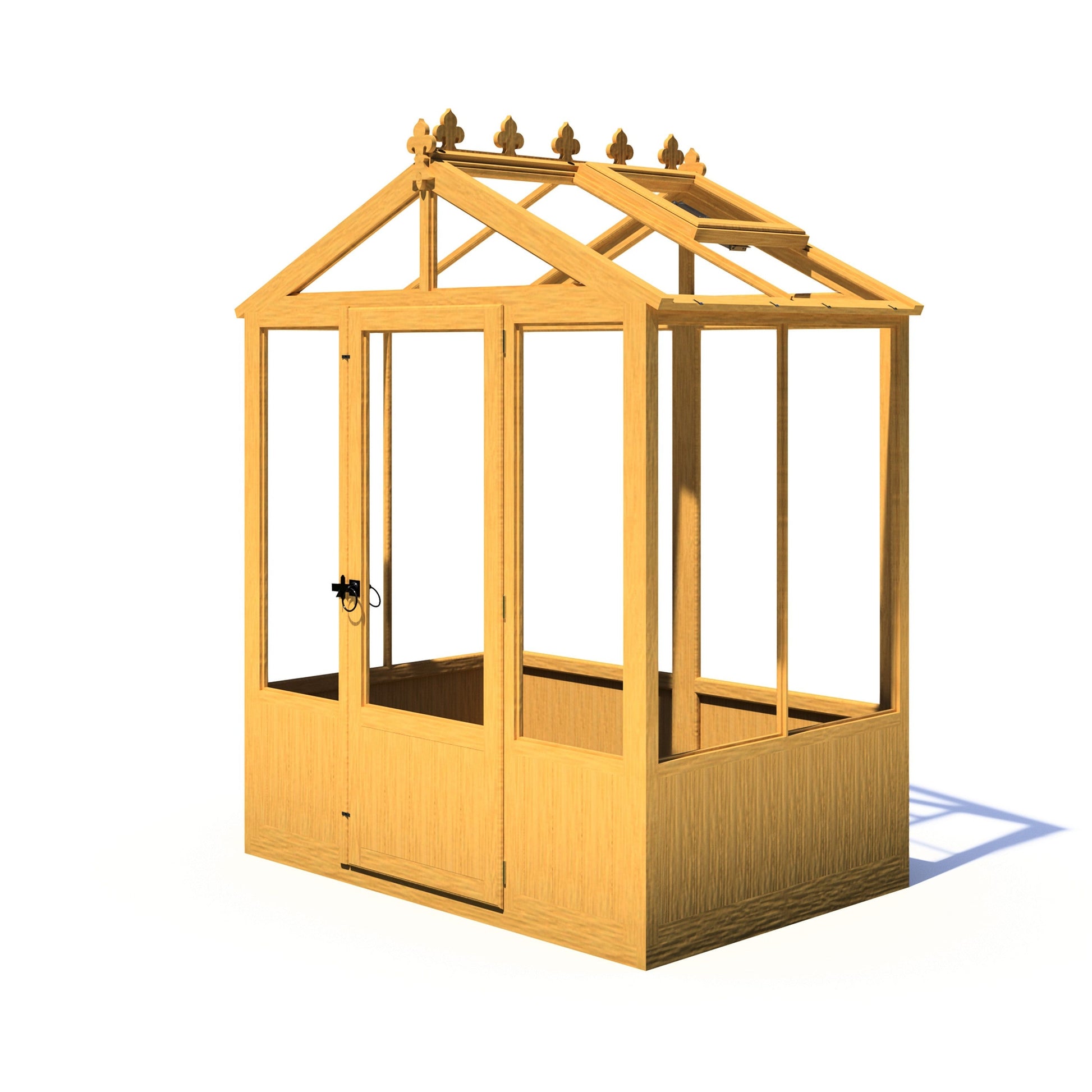 Featuring Shire's quality joinery and completed with an attractive finial and cresting to the roof, the Holkham is both practical as well as charming. The low wooden panels also add a very traditional detail to this lovely building. The greenhouse is glazed with toughened glass and has a single door with traditional gate latch handle. Roof windows have an automatic Bayliss opener supplied. As usual with a greenhouse, no floor is supplied and the greenhouse sits on a pressure treated base rail. Grass, soil or gravel are not sufficient as they will move with the weight of a building. This product is part of the Holkham collection.