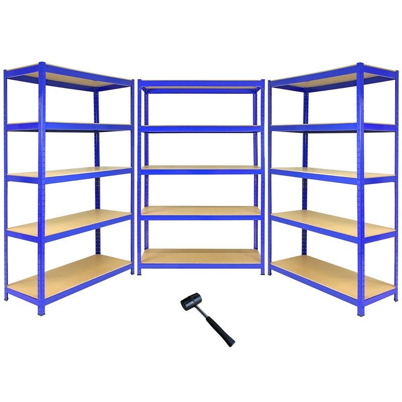 Additional Features: 3 x Extra wide 120cm blue powder coated racking / shelving bays ideal for garages warehouses utility rooms sheds and workshops with 5 thick MDF shelves. Finished with 4 layers of powder coated paint so will maintain a high quality finish. Heavy duty steel frame with a unique T-RAX keyhole technology allows for the racking to glide together to create a strong shelving unit. No bolts are required all you need is a mallet which we include for free. Each shelf has a weight tolerance of 280kg for evenly distributed loads (up to 1400kg per bay!). Each bay can be split in two to create two sturdy workbenches. Dimensions : 1200mm (w) x 450mm (d) x 1800mm (h).