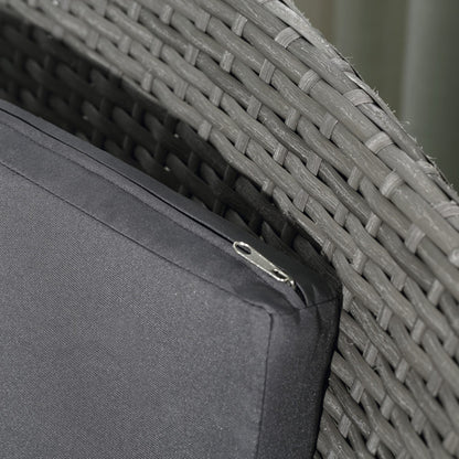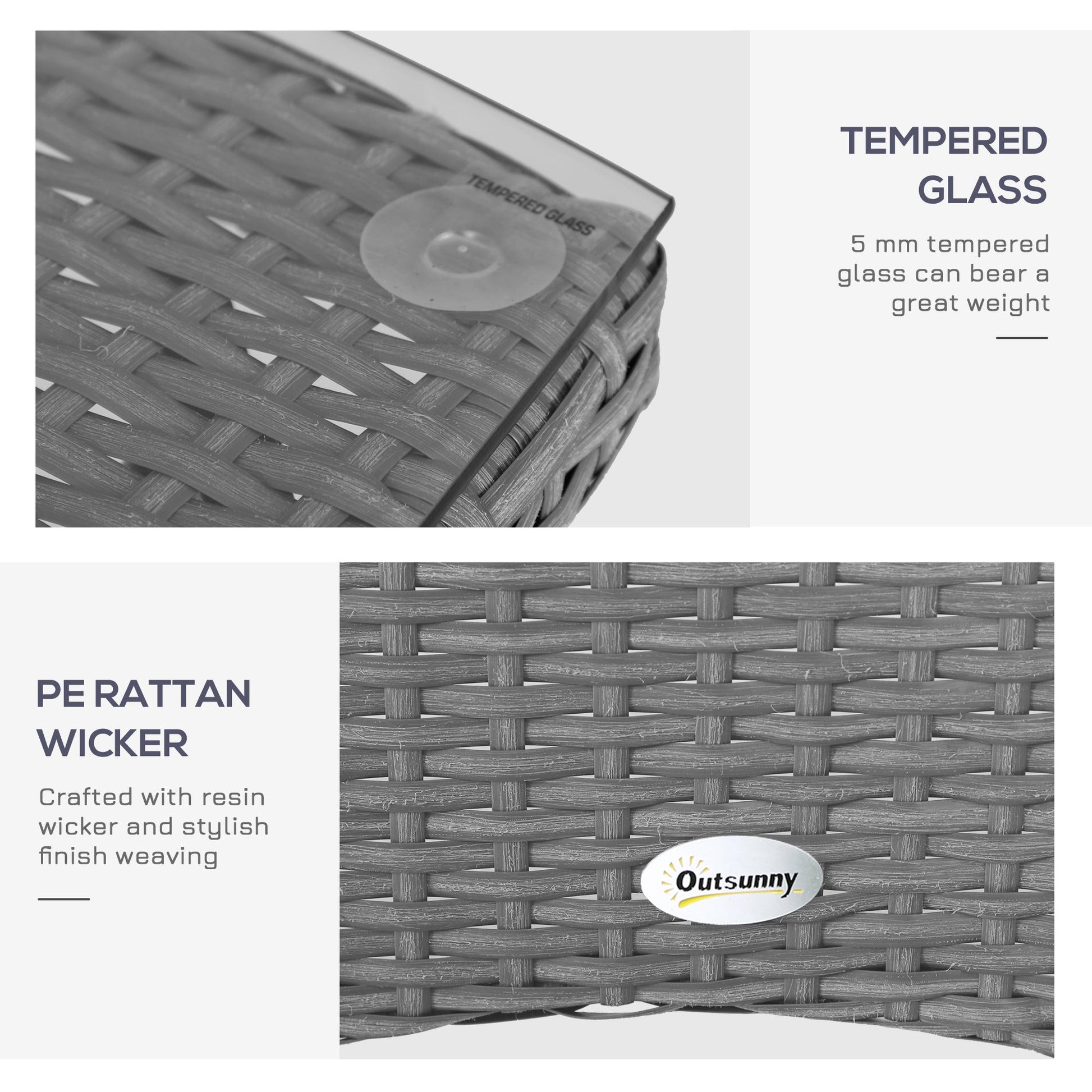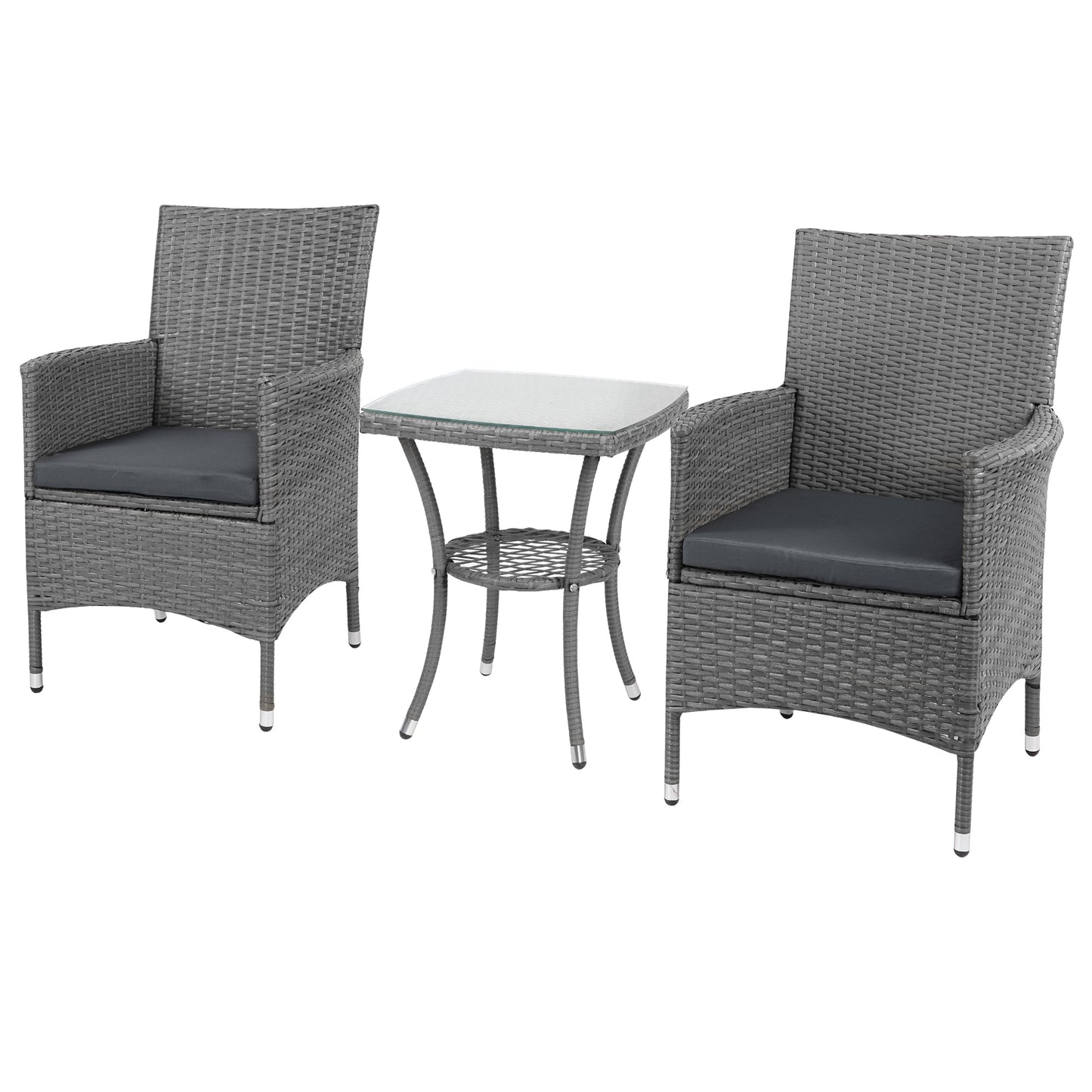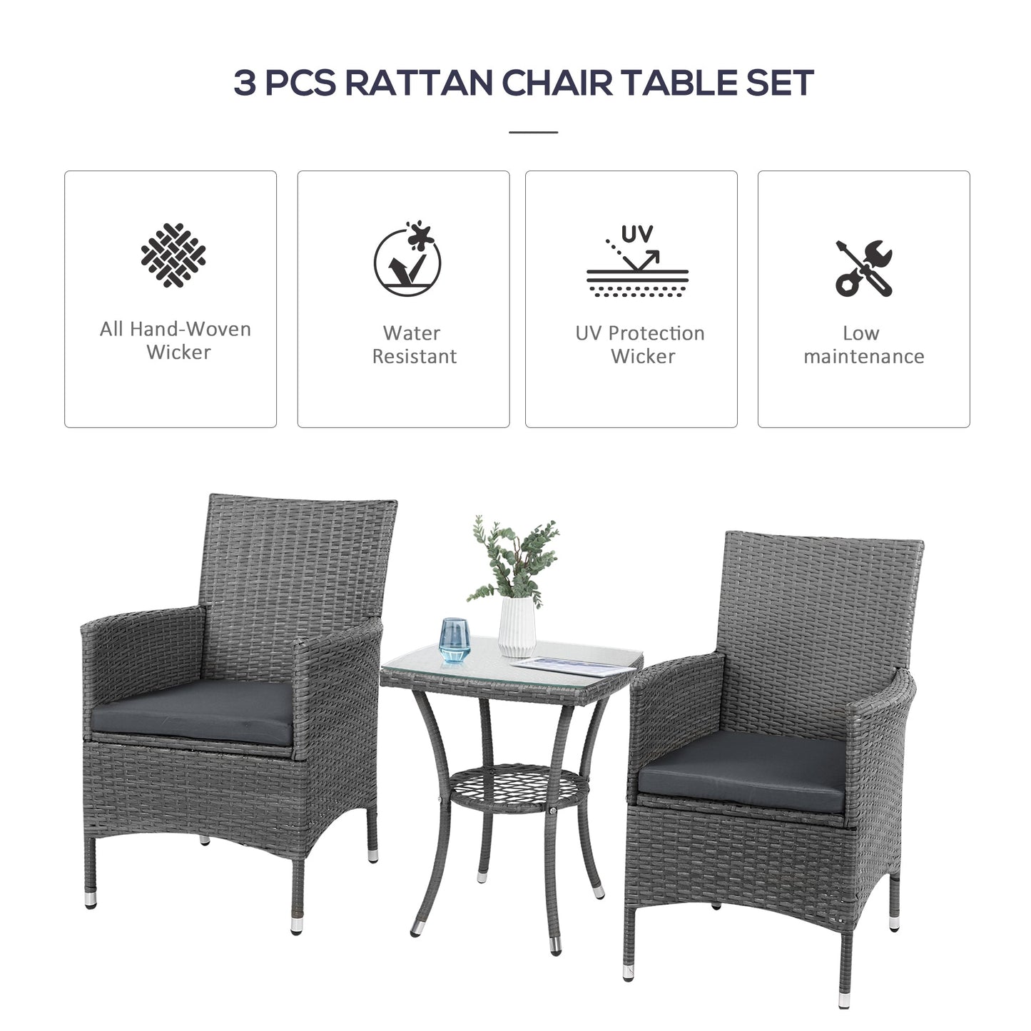 This Outsunny outdoor bistro set is great for any patio, garden, porch and similar spaces. Frames of the rattan bistro set is made from powder coated steel mean a strong structure, wrapped in plastic wicker for garden rattan style. UV and water resistant. Matching table gives a handy side surface, with a safe and sleek glass top. Repeat and use, season after season.