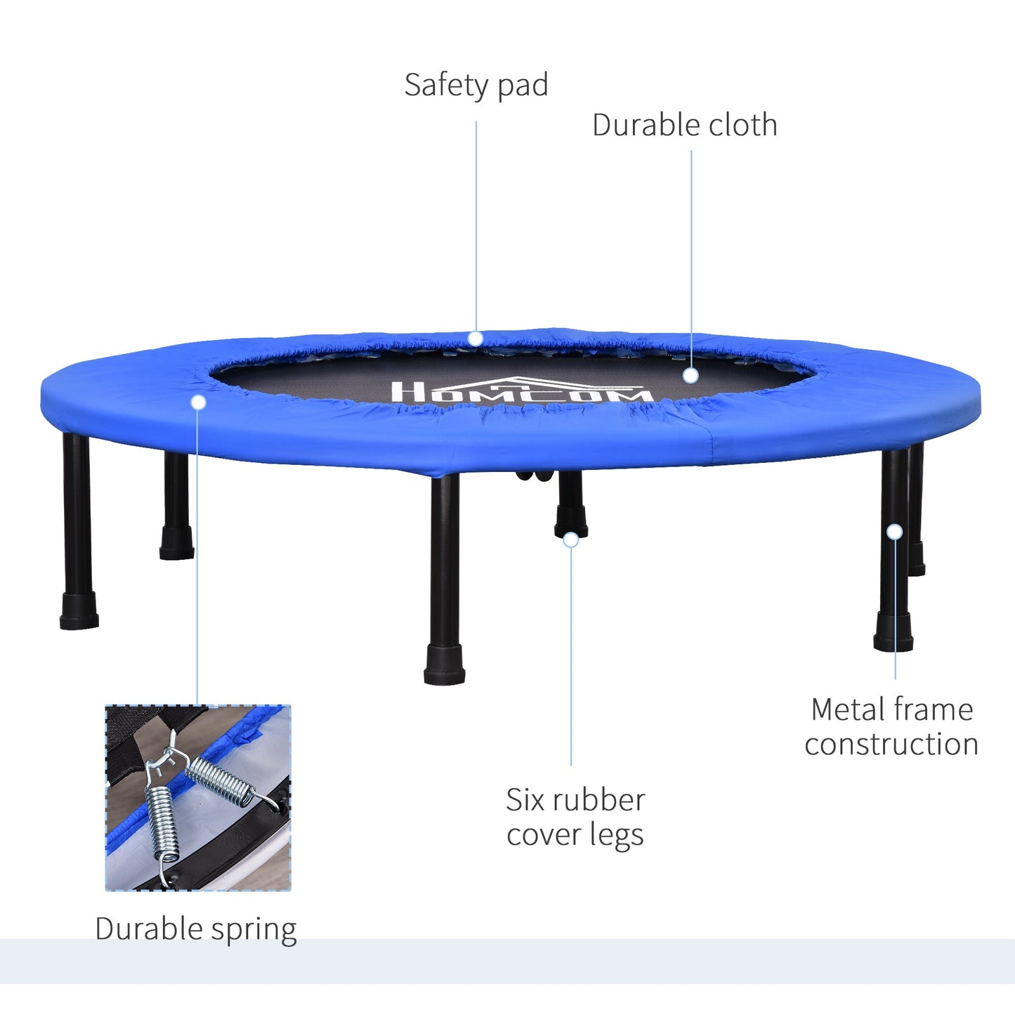This HOMCOM mini trampoline at home is a great item to have as part of your fitness workout routine. The rebounder is made from a rust-resistant metal frame with waterproof PVC padding. The trampoline net is portable and ideal for adults can be used indoors or outdoors, and will be a great addition to a home gym to improve physical development.