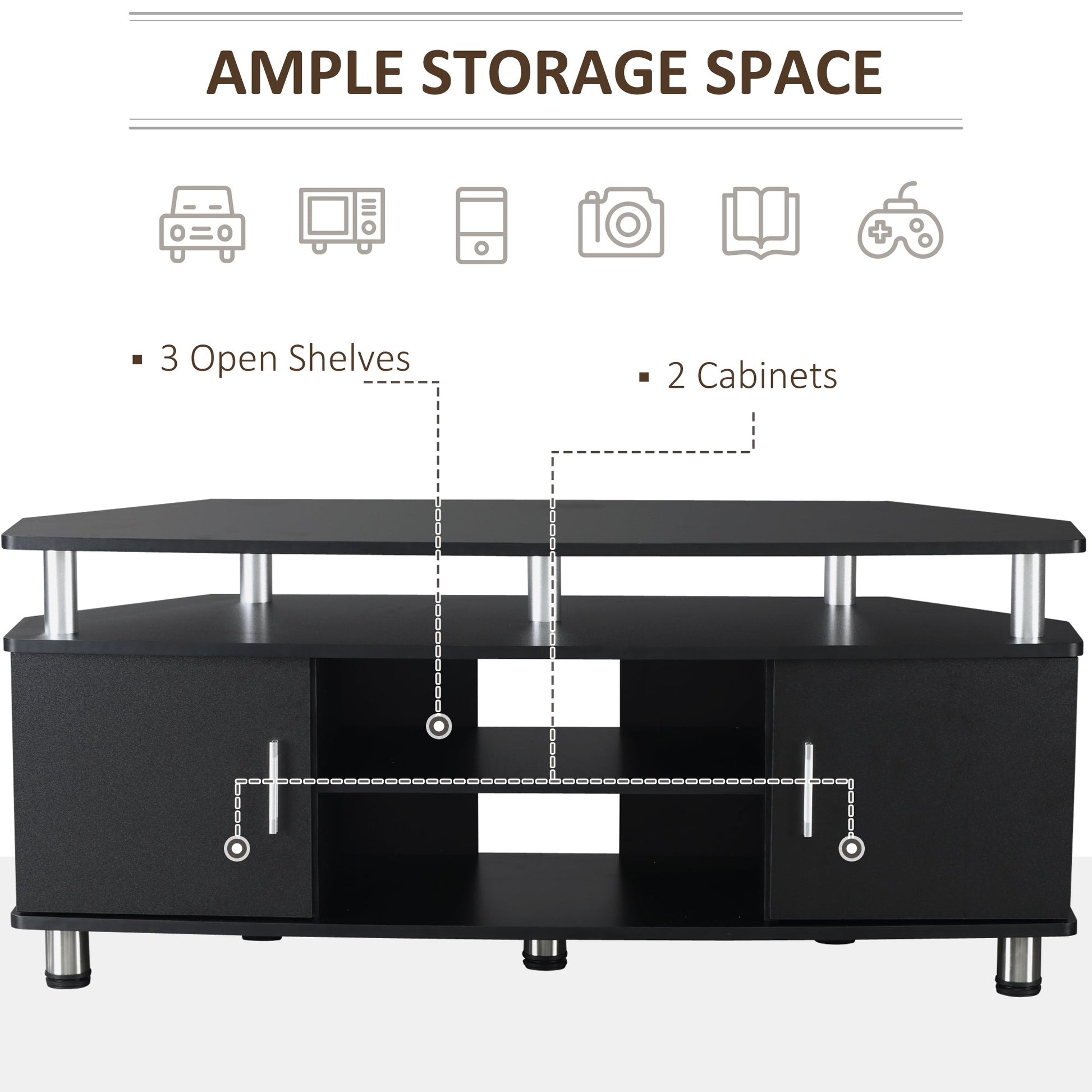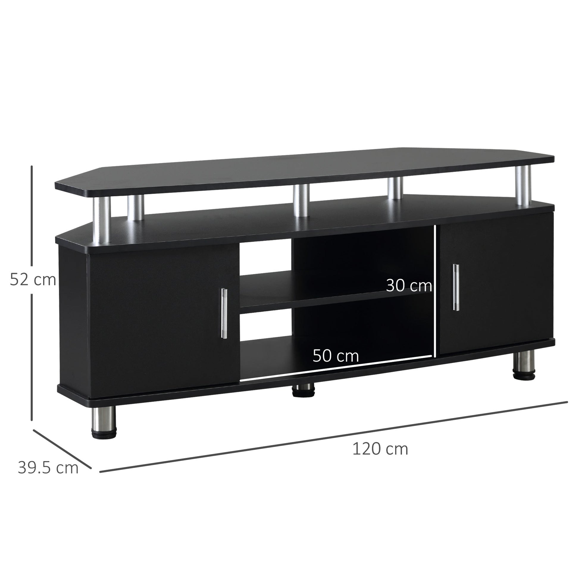 Elevate your entertainment space with this HOMCOM entertainment unit. Combines two middle shelves and two cupboards for storage - so you'll keep everything tidy, with a 120cm top shelf for holding your TV screen/monitor. Made from particle board, the body is durable, with aluminium accents to support the whole unit. Finished with handles on the doors to open and close easily.