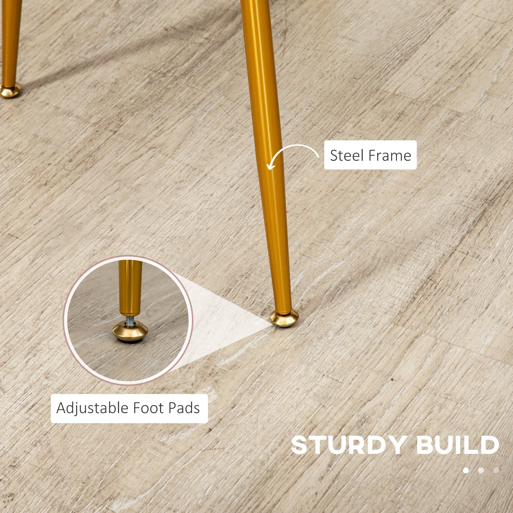 A quick, effortless home makeover: these two HOMCOM dining chairs. The velvet-feel upholstery creates a luxurious look, also soft on the skin. Padded seats for comfort, with curved back and seat to support and fit you body shape better. Strong powder coated steel legs provide support as you sit. Complete with handy adjustable feet. Two chairs included in a set.