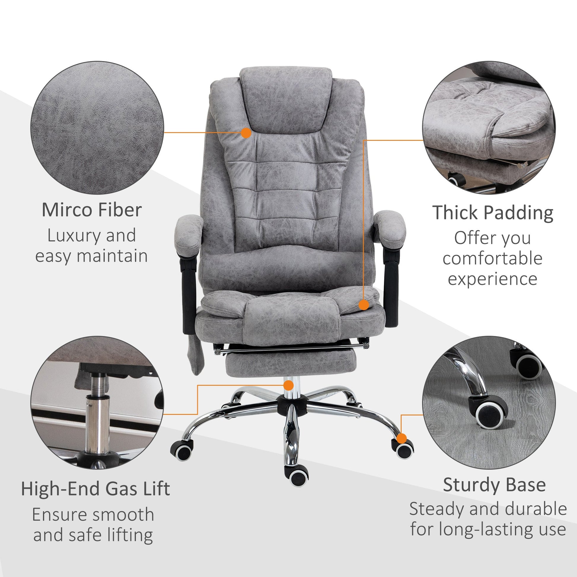 Work and relax, with this Vinsetto massage office chair. Wrapped in smooth and stylish microfibre upholstery, this computer chair is great to sit on and look at! But, most importantly, it has six heated massage points - four on the back, two on the seat: simply turn on the remote and relax. The seat gives wide sitting room, a high back and arms for support. With a 135 degree reclining backrest, finished with a manual footrest to elevate your lower body with ease.