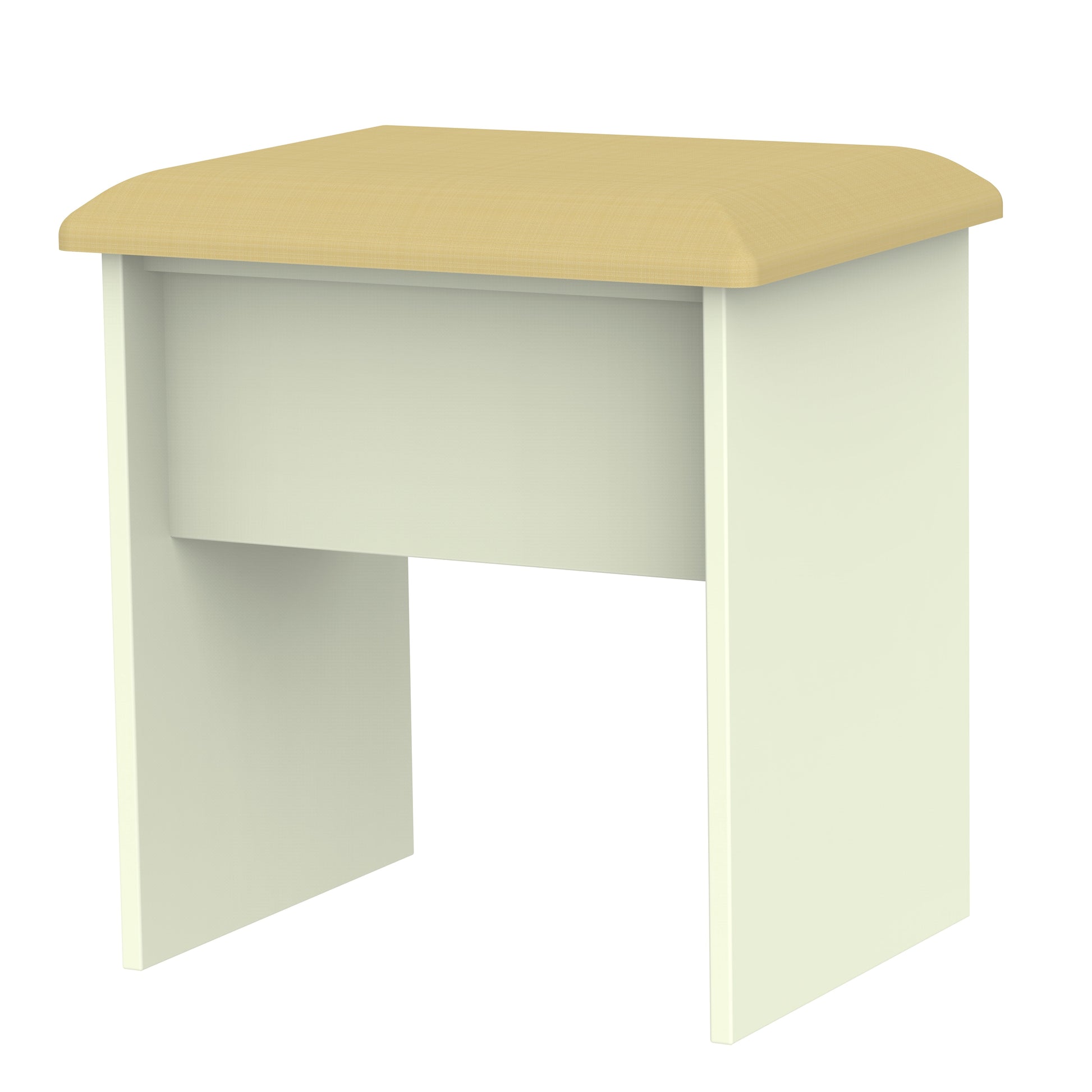 A small vanity stool. A light simple, yet sturdy design, with a soft cushioned seat. Makes an idea companion to a desk or vanity. The natural beauty of this bedroom range is complemented with curved tops and a variety of colour options. Enhanced by a delicate grooved design on all doors and drawers, with optional contrasting oak effect tops and handles this stunning bedroom range will suit any interior. All our furniture is made to order in the United Kingdom, to the highest quality. It is delivered within 10 working days direct to your location of choice by one of our two man delivery teams, and comes fully assembled (although legs may be removed to prevent damage in transit). Part of the Warwick Collection.