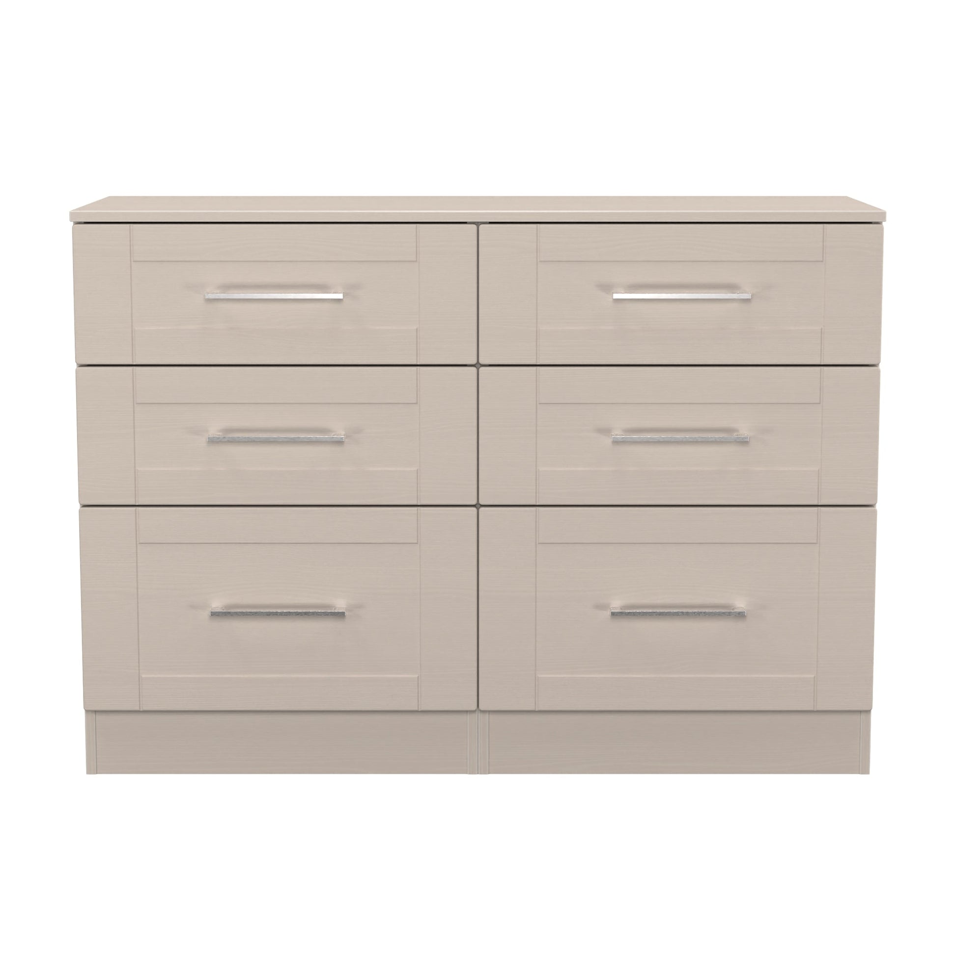 This double width 6 drawer chest of drawers is practical and stylish. Perfect for any home as a free standing storage unit. Wood grain effect, panelled design, recessed fronts and chrome handles, this Range is a beautifully elegant collection. With this range you have the freedom to choose from a wide range of furniture configurations, allowing you to create the perfect combination to optimise your storage space. All our furniture is made to order in the United Kingdom, to the highest quality. It is delivered within 10 working days direct to your location of choice by one of our two man delivery teams, and comes fully assembled (although legs may be removed to prevent damage in transit). Part of the York Collection.